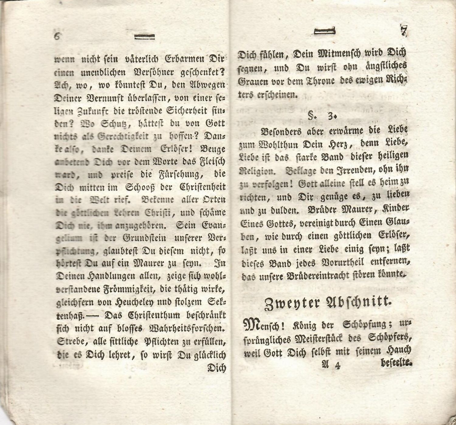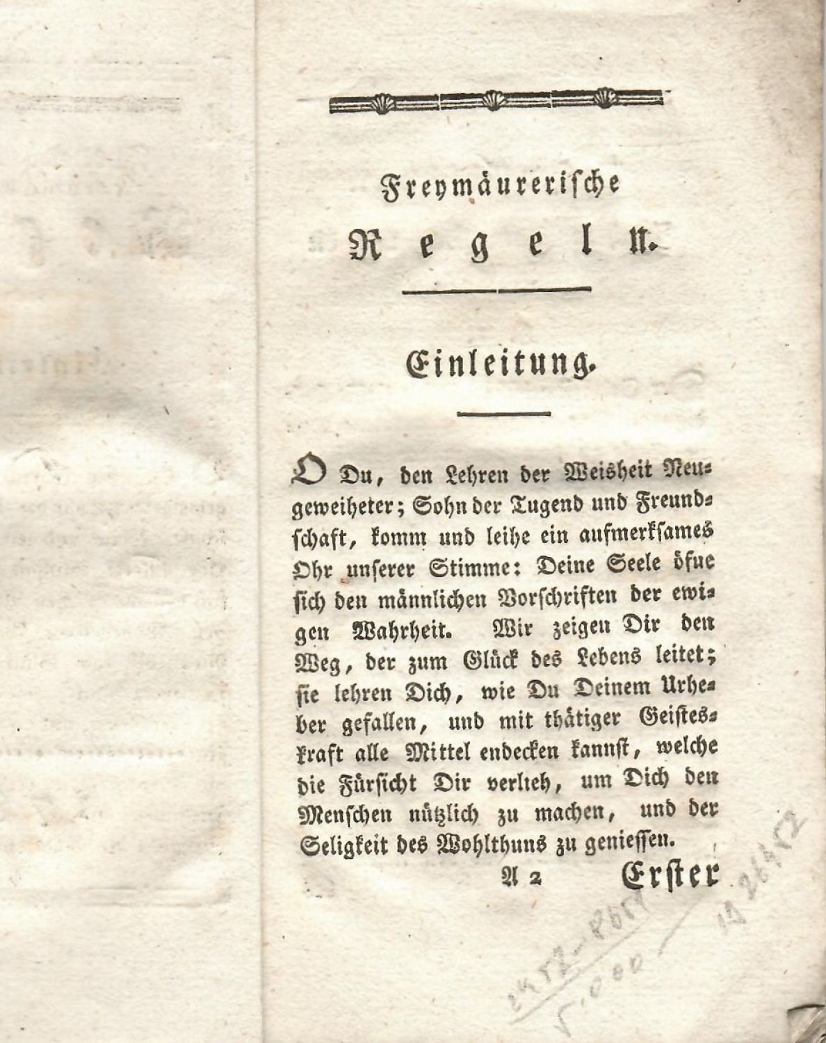 Tištěno švabachem, uprostřed horního okraje dvojitá mizící linka, tit. list olemovaný rámečkem z prolamujících se ornamentů, na tit. listu a v závěru drobné viněty, v záhlaví folia A2 ozdobná tyč, tučně tištěné versálky. <br>Původní brožurka ve hřbetu přelepená páskou z dobového škrobového papíru, na tit. listu staré razítko zednářské lóže v Hildesheimu a uprostřed horního okraje nalepen malý pap. štítek s evidenčním číslem.
