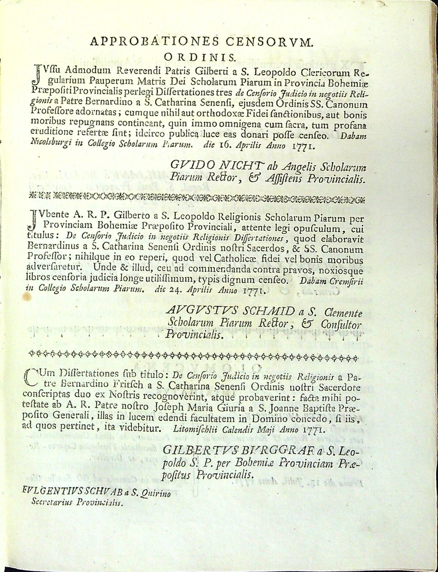 DE CENSORIO IVDICIO IN RELIGIONIS NEGOTIIS DISSERTATIONES QVAS ELABORAVIT BERNARDINVS FRITSCH A S. CATHARINA SENENSI CLER. REGVL. SCHOLARVM PIARVM IN DIETRICHSTEINIANO COLLEGIO NICOLSBVRGI SS. CANONVM PROFESSOR. CVM APPROBATIONE CENSORVM.