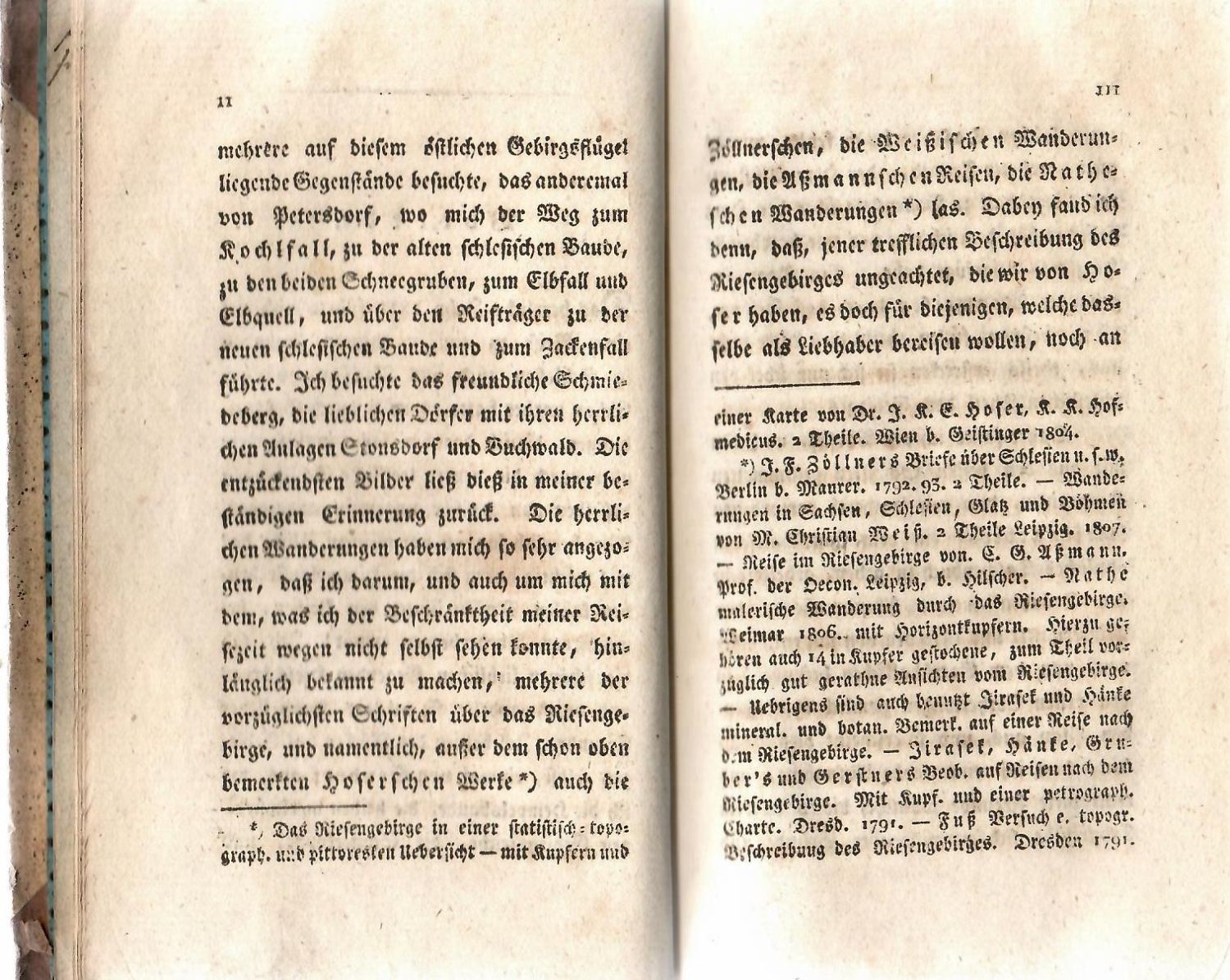| Ilustrace: | Ve front. rytina s pohledem na Krkonoše ze slezské strany, na rytém tit. l. pohled na kapli sv. Vavřince na vrcholu Sněžky (obojí sign. "J. G. A. Frenzel sc: Dresd:") a rozkl., ručně kolor. rytá mapa Kladska (23 x 29 cm); druhá mapa chybí. |