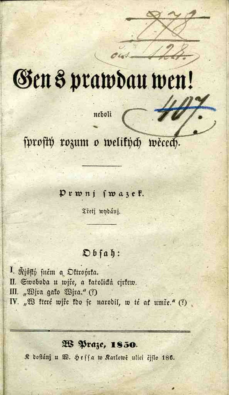 Gen s prawdau wen! neboli sprostý rozum o welikých wěcech. Prwnj - třetj swazek