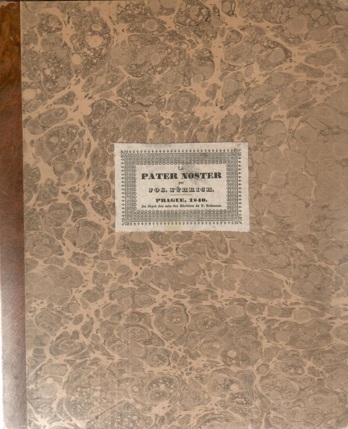 Listy s doprovodným textem při horním okraji oříznuté (nezasahuje do textu), papír zahnědlý, místy drobné hnědé skvrnky. Kartonová vazba potažená mramorovaným papírem s koženým hřbetem, kůže ve hřbetu místy odřená, na přední desce nalepený původní pap. štítek z názvem a nakl. údaji. Vazba je dílem vídeňského knihaře Theodora Mümmlera. Na přední předsádce rkp. poznámky vztahující se k vydání cyklu. Z němčiny do francouzštiny přeložil Demarteau. Dílo vyšlo v prvém vydání německy roku 1826 v Praze pod názvem "Vater unser", druhé vydání roku 1840 a paralelně s ním francouzské.<br>Josef Führich (1800 Chrastava - 1876 Vídeň), malíř a grafik, od roku 1840 působil jako profesor na Akademii výtvarných umění ve Vídni, roku 1861 byl povýšen do šlechtického stavu.<br> Anton Müller (1792 Osečná u Mimoně - 1843 Praha), estetik a kritik, od roku 1819 působil na universitě v Innsbrucku jako profesor klasických jazyků a estetiky, po přímluvě hraběte Chotka od roku 1823 na pražské universitě jako nástupce Dambeckův, přednášel dějiny filosofie, estetiku a etiku na katedře krásných věd. Mezi jeho posluchače patřil i malíř Josef Führich, jehož několik výtvarných prací doprovodil textem.