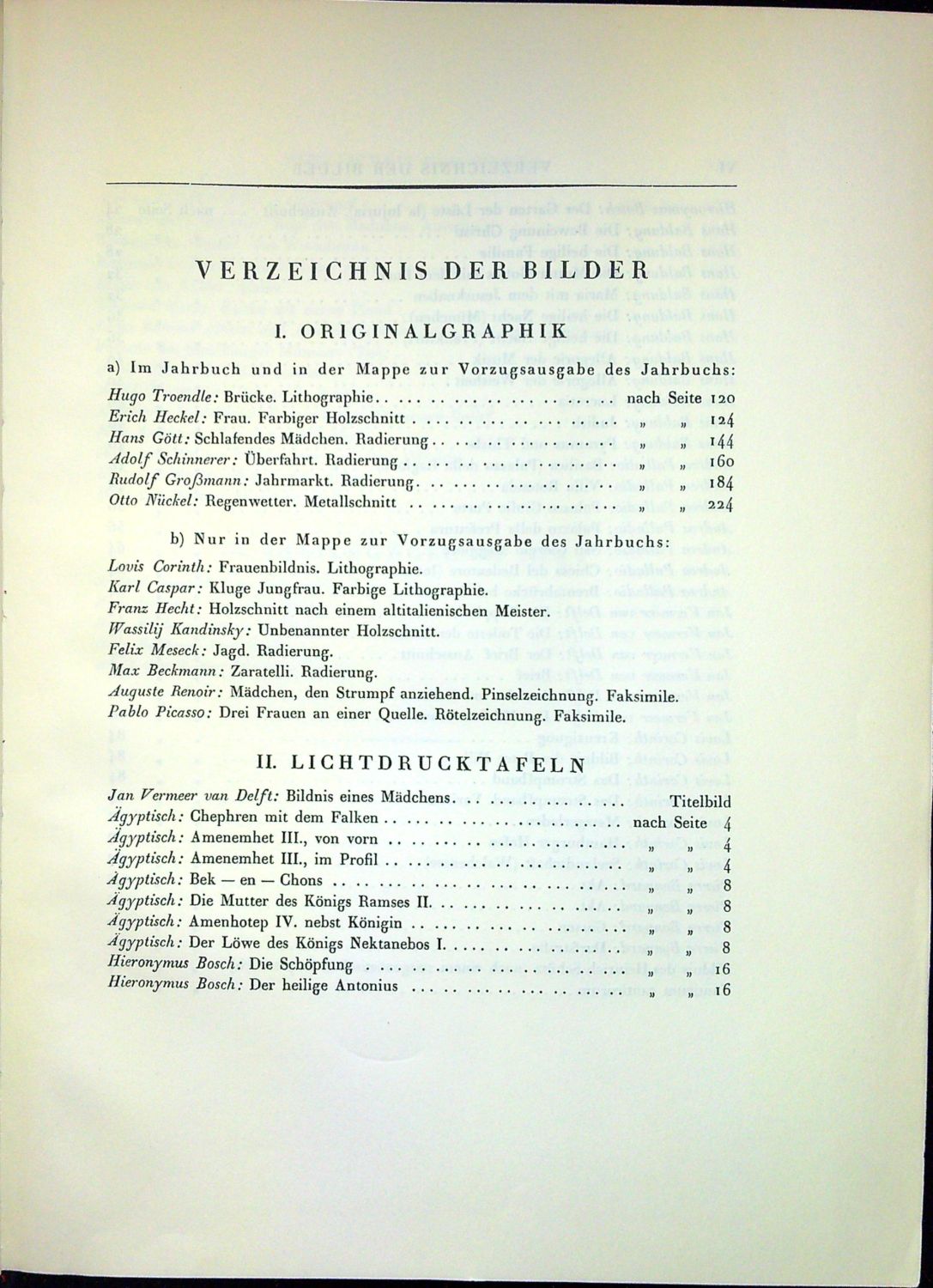 Ve sborníku je 6 původních grafických příloh: za stranou 120 původní litografie, Hugo Troendle; za stranou 124 původní dvoubarevný dřevoryt, Erich Heckel; za stranou 144 původní lept, Hans Gött; za stranou 160 původní lept, Adolf Schinnerer; za stranou 184 původní lept, Rudolf Grossmann; za stranou 224 původní dřevoryt, Otto Nückel. Ostatní přílohy tištěné hlubotiskem vyjma přílohy za stranou 112, barevně tištěnou faksimilí dřevořezu z 15. století. Původní kartonová obálka s plátěným hřbetem, mírně zašpiněná a na přední desce lehce odřená. Předmluvou opatřil Julius Meier-Graefe a textem doprovodil Wilhelm Hausenstein.