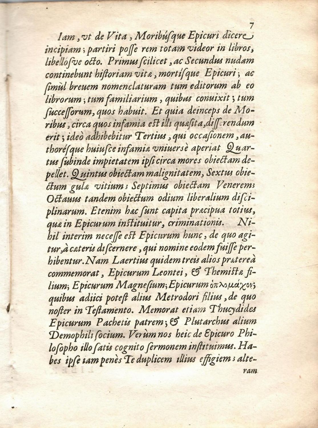 Latinský text antikvou, řecký alfabetou, signatury, stránkové kustody, živá záhlaví s vyznačením jednotlivých oddílů knihy, tištěné poznámky po stranách. Ve front. mědiryt. portrét Epikura, na tit. listu dřevořezová viněta, iniciály ve dvojitém rámečku na rostlinném pozadí ve výši 2-5 řádků, vstupní pásový vlys, tučně tištěné versálky, jednoduché i ozdobné linky, koncová viněta..<br>Dobová pergamenová vazba, zašpiněná a zkrabatělá. Na předním přídeští nalepeno ex libris Thun-Hohensteinské děčínské knihovny. Papír zahnědlý, na několika stranách drobné skvrny od inkoustu, od strany 25 stopy způsobené červotočem, str. 49-56 při horní části uvolněny z knižního bloku, str. 161-167 při dolním vnitřním okraji pomačkány. Velmi vzácné první vydání s variantním titulním listem, na většině exemplářů je jako místo vydání uveden Lyon a jako nakladatel G. Barbier, druhé vydání vyšlo až roku 1656. Pařížský nakladatel Louis de Heuqueville vydal v roce 1647 jiné Gassendiho dílo "Institutio Astronomica" a zřejmě se podílel i na vydání "De vita" a část nákladu vyšla s uvedením jeho jména jako nakladatele.<br>Pierre Gassendi (1592-1655), francouzský filosof, kněz, matematik a astronom, čelný představitel skupiny svobodomyslných intelektuálů v Paříži. Jako první publikoval výsledky svého pozorování přechodu Merkuru přes Slunce v roce 1631. Publikoval řadu prací o Epikúrovi a epikureismu, snažil se uvést v soulad epikurejský atomismus s křesťanstvím. Byl odpůrcem filosofických názorů R. Descarta. Ve svých filosofických pracích se zabýval vztahem mezi skepticismem a metafysikou. Usiloval o nalezení teorie, která by se dokázala vyhnout skeptické kritice a poskytla základ pro novodobé vědecké poznání. <br>Einige Lagen papierbedingt stark gebräunt, Vorsätze, Frontispiz und Titel abgegriffen, ab Seite 25 (ikld. Hinterdeckel) kleine Wurmlöcher an der Rändern, teils Spuren von Feuchtigkeit (einige Blätter etwas fleckig und gewellt), Lage G und X zum Teil von der Buchbindung gelöst, Frontispiz im Unterrand mit kl. Einriss, cca 2,5 cm. Die Bindung leicht locker. Aufgeklebtes heraldisches Wappenexlibris der gräflichen Familie von Thun-Hohenstein, Tetschen auf dem vord. Innendeckel. Druckermarke auf dem Titel. - Sehr seltene, rare Ausgabe. <br>Umfangreiche Abhandlung über das Leben, Philosophie und Lehre des griechischen Philosophen Epikur von Samos (342-271 v. Chr.), die im Jahr der Erstausgabe (Lyon, Barbier, 1647; II. Ausgabe 1656 Hague) erschienen ist. - Pierre Gassendi (1592-1655), Dompropst zu Digne, gehört zu den grössten und vielseitigsten Gelehrten seiner Zeit. Er zeichnete sich durch seine Ansichten in der Mathematik, Physik, Astronomie und Philosophie. Das Leben und den Charakter Epikurs stellt Gassendi in vorliegendem Werk mit strenger Wahrheitsliebe dar, klärt seine Philosophie auf und benutz sie als Grundlage eines philosophischen Systems. Das Buch widmete Gassendi seinem Freund und Patron Francois Luillier. Text lateinisch, stellenw. griechisch.