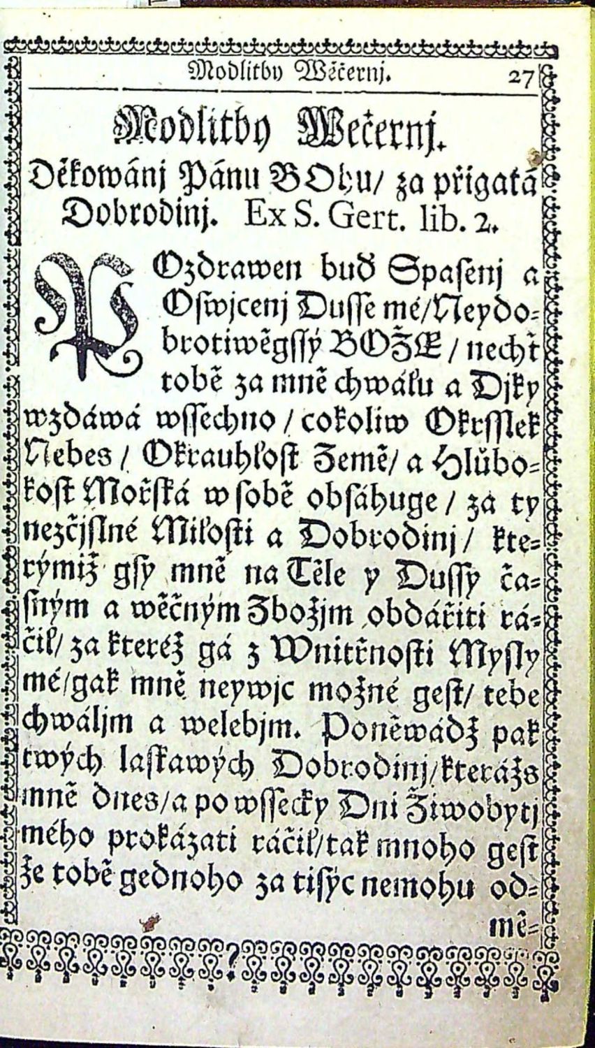 Knihopis 2683<br>Tištěno švabachem, živá záhlaví od sazby oddělená jednoduchou linkou, text olemovaný rámečkem z ornamentů, iniciály propletené úponky zalomené do výše 2-4 řádků., plné iniciály na ornamentálním pozadsí zalomené do výše 4-6 řádků, ozdobné lišty z ornamentů, viněty, první část knihy se skládá z 12 dílů. Samostatně paginovaná druhá část s titulním listem "Welmi Užitečné A Potěssytedlné Rozmlauwánj/ O weliké Platnost a Vžitku Austnjch Modliteb/ Stůro na wětssým Djle z Zgewenj SS. Geretrudy a Mechtyldy. wytažené A Těmto Modlitbám, k obwzlásstnjmu Srdce Potěssenj. wssem Pobožným a BOhabogjcým Křestianům/ připogené". <br>Kožená vazba z 19. století, na přední desce tlačený kříž protknutý paprsky, hřbet dělený zlacenou a tlačenou lištou do čtyř polí, žlutě barvené ořízky. Titulní list nahrazen faksimilií.