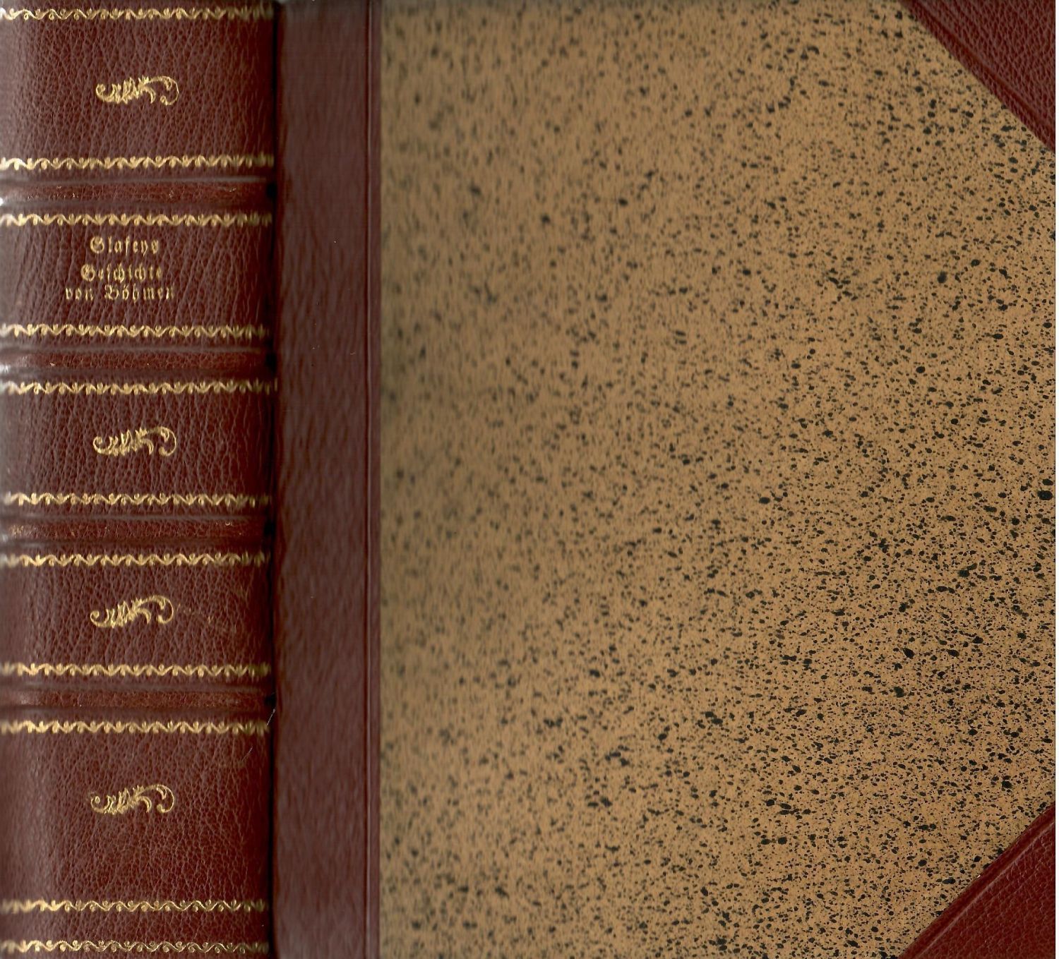 Německý text gotikou, latinská slova antikvou, signatury, stránkové kustody, arabské číslování stran při horním vnějším okraji, živá záhlaví od sazby oddělená jednoduchou linkou, tištěné marginálie po stranách, poznámky pod čarou, vstupní vlys a závěrečná dřevořezová viněta rostlinného charakteru, obrysové iniciály zalomené do výše 3-8 řádků, versálky ve výši dvou řádků.<br>Vazba z konce 20. století, kožený hřbet a nárožnice, ve hřbetu 4 vazy, ve druhém poli tlačený a zlacený název, v ostatních polích při okrajích tlačená a zlacená linka z ornamentů, uprostřed polí ozdůbka rostlinného charakteru, ručně šitý kapitálek, červeně barvené ořízky. Ochranné kartonové pouzdro. Ve stavu velmi dobrém.<br>Dějiny Čech od přijetí křesťanství do období vlády císaře Karla VI. Kompilace děl starších českých dějepisců. A. F. Glafey (1692-1753), historik a filosof, archivář v Drážďanech.