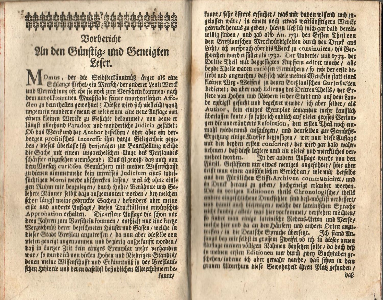 Tištěno švabachem, latinský text antikvou, arabská paginace stran uprostřed horního okraje v kulatých závorkách mezi drobnými lístky od sazby oddělená jednoduchou linkou, vstupní pásové vlysy, koncové viněty. Tři samostatné titulní listy. I. díl "Von deren Erbauung, Erweiterung und Bevestigung, dann von denen darinn = und ausserhalb derselben befindlichen Fürstlichen Gestisstern, Klöstern, Pfarr=Kirchen und Capellen, deren Fundirung und Erbauung samt andern mehreren curiösen Nachrichten, alles aus bewährten Autoribus, Documenten, .... II. díl: "Worinnen dasjenige, wasa im ersten Theile entweder gar nict, oder unvollkommen stehet, naceholet wird, Durc einen Liebhaber Bresslanischer und Schlesischer Geschichten", III. díl: "Worinnen von einigen Solennitäten, Ceremonien, Gebräuchen und Gewohnheiten der Stadt Bresslau gehandelt wird".<br>Dobová vazba s kartonovými deskami potaženými olejovým papírem, peramen. hřbet a nárožnice, červeně barvené ořízky. Vazba mírně odřená, pergamen ve hřbetu lehce zkrabatělý, na tit. listu prvnío dílo perem začerněný vlastnický rkp. přípis, dvě rytiny při okraji natržené. Chybí 4. díl, který vyšel o rok později jako dodatek k dílům již vydaným.<br>Daniel Gomolcke či Gomolcky (možná Homolka) vratislavský historik 18. století. Čeněk Zíbrt v Českém lidu (XIII., str. 273) publikoval jednu z vratislavských ženských zábav, kterou přeložil z nabízeného díla. Bývala součástí střeleckých slavností. Devět až deset žen se účastnilo běhu o závod, cílem byla tyč, nahoře upravená na způsob kříže. Uprostřed byl ženský kožich, naoře čepice, po stranách střevíce a punčochy, rukávník a drnkačka. Během běhu žen šašek s plácačkou tropil různé žertíky. Vítězka dostala kožich, druhá čepici, třetí rukávník, ... a poslední drnkačku. Závod je v knize vyobrazený na rytině ve III. dílu mezi str. 182-183.