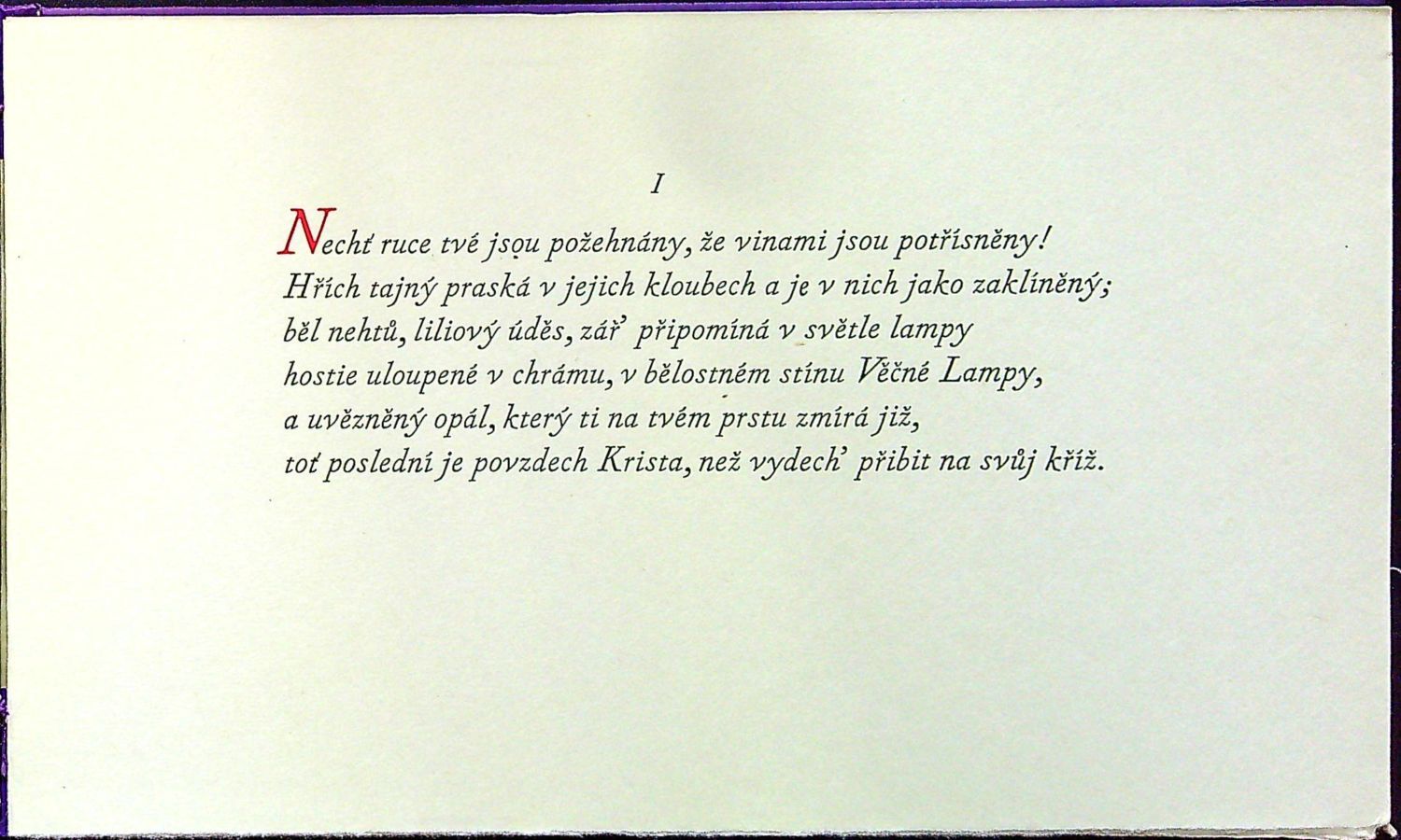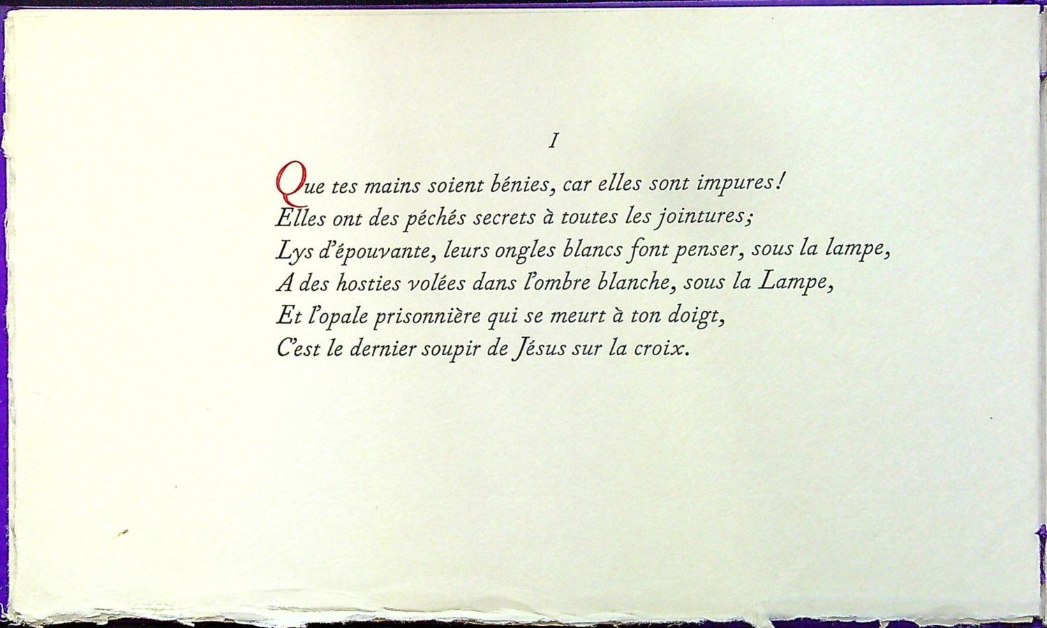 Ex. č. 17 z 25 výtisků tištěných na pravém japanu, dvoubarevně, versálkami tištěný titulní list, zčásti též versálkami tištěná tiráž, plné, písmem Fournierovým červeně tištěné iniciály ve volném prostoru. Za vedení Karla Dyrynka vytiskla Státní tiskárna, upravil a původním, tužkou podepsaným leptem ve front. vyzdobil František Kobliha. Dvojjazyčný text: na levé straně francouzský originál, na straně pravé český překlad Jindřicha Hořejšího. Studii o autorovi napsal Jiří Karásek ze Lvovic, v tiráži jeho podpis červeným perem. Původní kartonová vazba zabalená ve fialovém papíru (původní adjustace), knižní blok šitý nití téže barvy; původní ochranné kartonové pouzdro s pap. štítkem ve hřbetu částečně vybledlé. Rozměr vazby 145 x 240 mm.