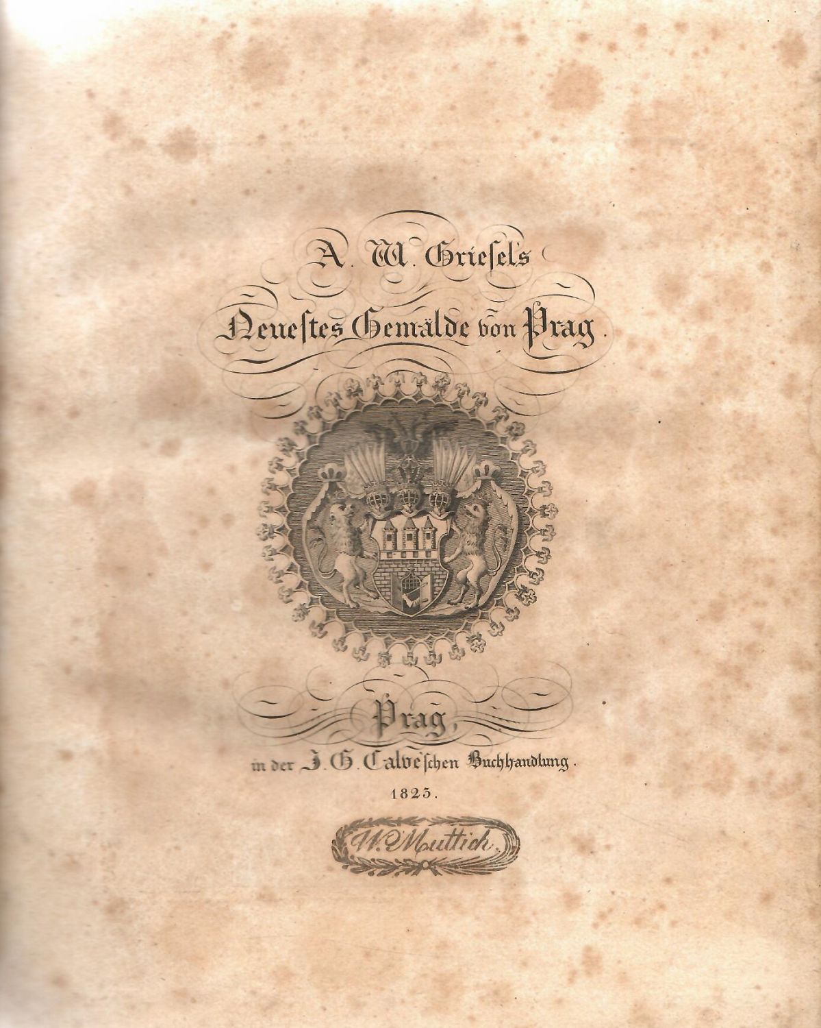Nebehay-Wagner I/302, 210 <br>Tištěno antikvou, tištěné poznámky pod čarou.<br>Dobová vazba s kartonovými deskami potaženými mramorovaným papírem, kožený hřbet a nárožnice, barvené ořízky, široké okraje. Na hřbetu dva dobové kožené štítky, horní červený s tlačeným a zlaceným názvem olemovaným ozdobným pásem, spodní světle šedý olemovaný stejným pásem. Naražené rohy, papír s rytinami a tit. list následkem kyselosti papíru místy s hnědými flíčky. Rozkládací rytiny s mapami za textem tištěné na jiném druhu papíru (nekyselém) čisté, jedna z nich při spodním okraji lehce natržená. <br> August Franz Wenzel Griesel (1783-1825), německý spisovatel z Prahy. Vystudoval filosofii, v letech 1811-1814 knihkupcem a poté odhadcem knih, v roce 1824 redigoval společně s W. Gerlem pražský časopis "Der Kranz".