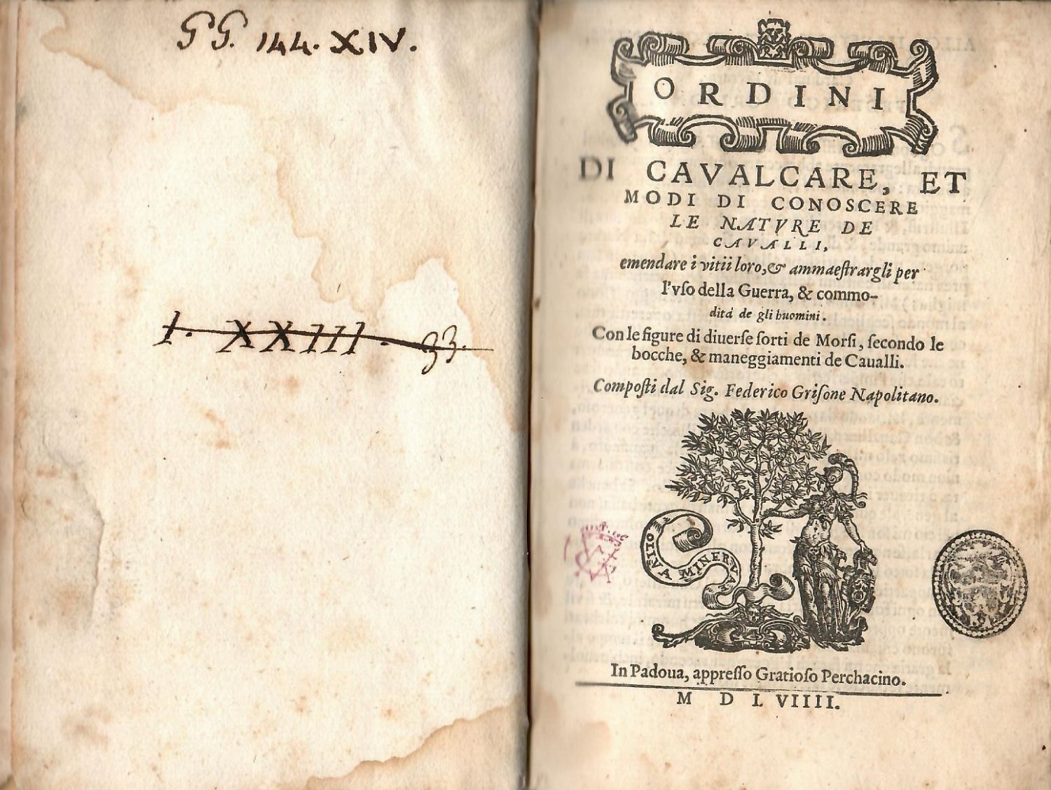 ORDINI DI CAVALCARE, ET MODI DI CONOSCERE LE NATURE DE CAVALLI, emendare i vitii lovo, et ammaestrargli per l´vso della Guerra, & commodita de gli huomini. Con le figure di diuerse forti de Morsi, secondo le bocche, & maneggiamenti de Caualli. Composti dal Sig. Federico Grisone Napolitano.