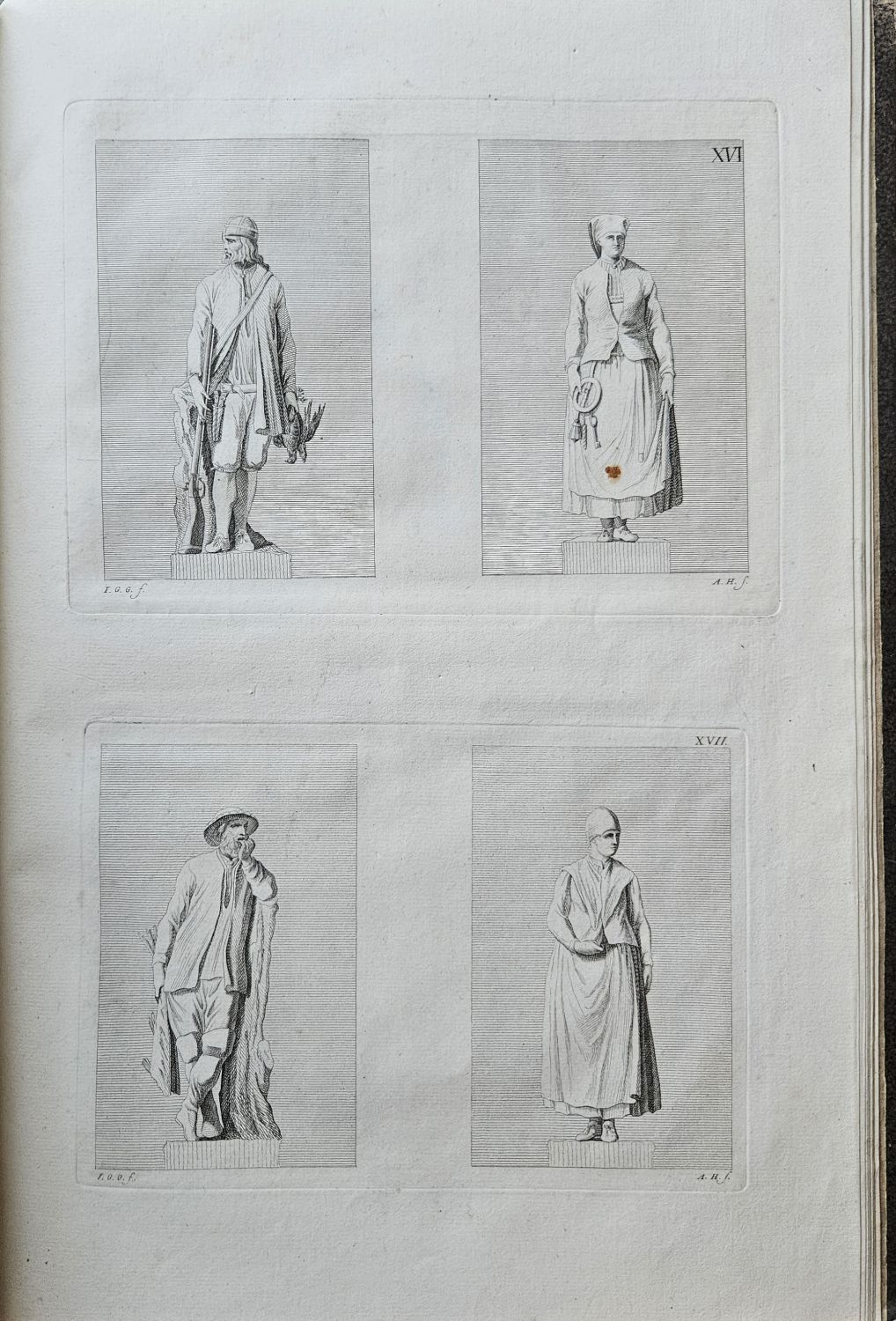 | Ilustrace: | Na 16 mědiryt. přílohách 32 vyobrazení různých soch norských a faerských rybářů, sedláků a jejich ženských protějšků v různých národních krojích (na první příloze obelisk), na 17 příloze, která je přes dvě strany vyobrazeno "Norské údolí", park u zámku, ve kterém se sochy nacházejí. Dle soch J. G. Grunda vyryl A. Heckel. |
