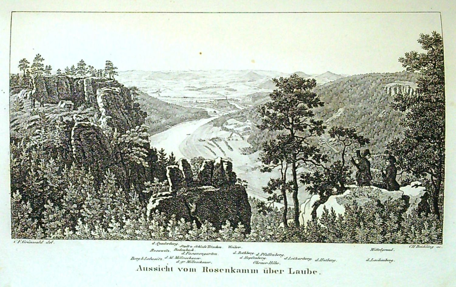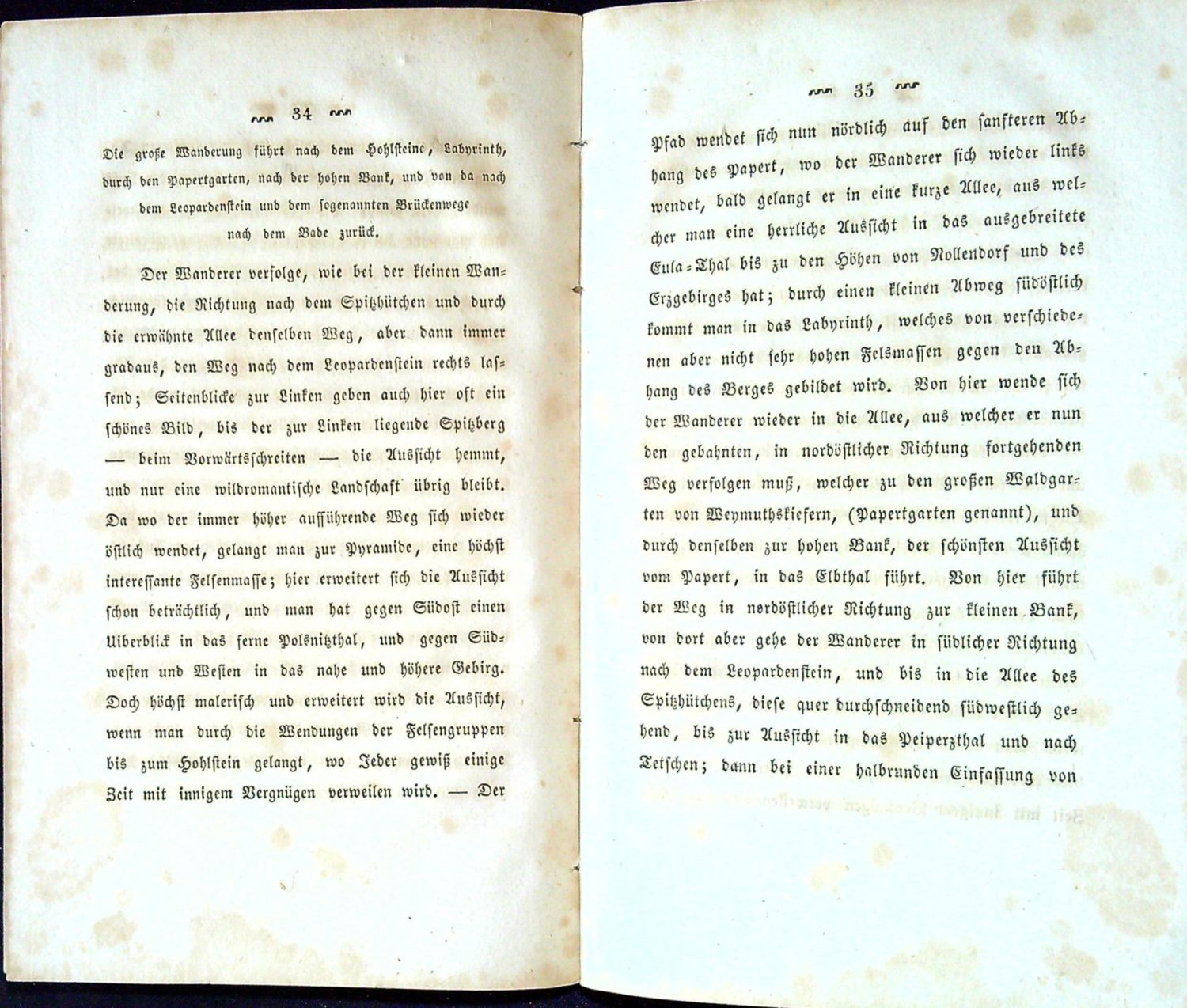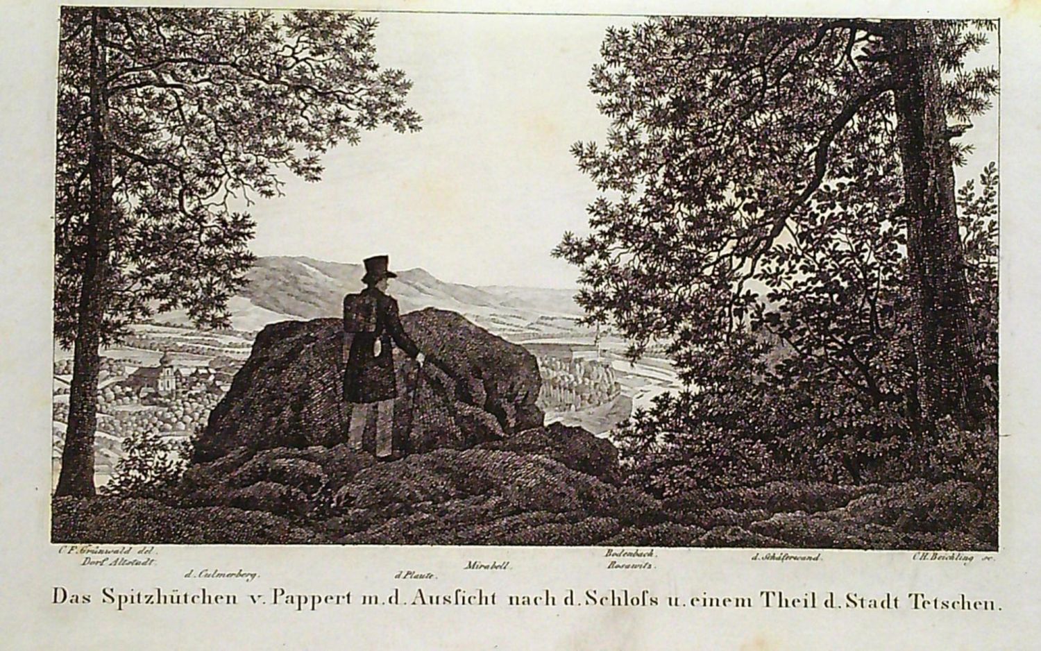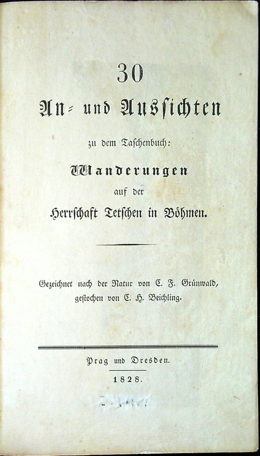 Nebehay-W 215<br>Tištěno gotikou, na sedmi listech za tit. listem jména abonentů knihy tištěná antikvou a s udáním počtu objednaných knih, tištěné poznámky pod čarou, arabská paginace stran uprostřed horního okraje mezi krátkými vlnovkami. Ve front. první knihy lept od C. H. Beichlinga dle kresby C. F. Grünewalda o rozměru desky 187 x 115 mm s vyobrazením Vrabince u obce Těchlovice na Děčínsku. Druhý svazek s titulním listem "30 An = und Aussichten zu dem Taschenbuch: Wanderungen auf der Herrschaft Tetschen in Böhmen. Gezeichnet nach der Natur von C. F. Grünwald, gestochen von C. H. Beichling", Prag und Dresden, 1828. Za titulním listem 30 leptů od stejných autorů (rozměry celé desky cca 115 x 185 mm) s vyobrazením Děčína, přírodních scenérií a různých pozoruhodností v okolí Děčína. <br>Dobové kartonové vazby potažené modrým papírem. Naražené rohy, první svazek je ve hřbetu naprasklý a na několika místech chybí drobné kousky pap. pokryvu, u druhého svazku při dolním okraji hřbetu a dolním okraji zadní desky u hřbetu chybí kousek pap. pokryvu. Papír zahnědlý, místy drobné hnědé skvrnky, na tit. listu prvého svazku pod impresem nepravidelně utržený papír. Dobové ochranné kartonové pouzdro. <br>Velmi vzácný a kompletní průvodce Děčínskem s krásnými romantickými lepty C. H. Beichlinga dle kreseb C. F. Grünwalda. Souborný katalog knih ČR eviduje pouze 4 exempláře, z toho jsou pouze tři textové a jeden v muzeu v Rokycanech je neúplný - bez front. a dvou rytin ve druhém svazku.<br>Karl Heinrich Beichling (1803 - 1876) byl německý architekt, krajinář a grafik.
