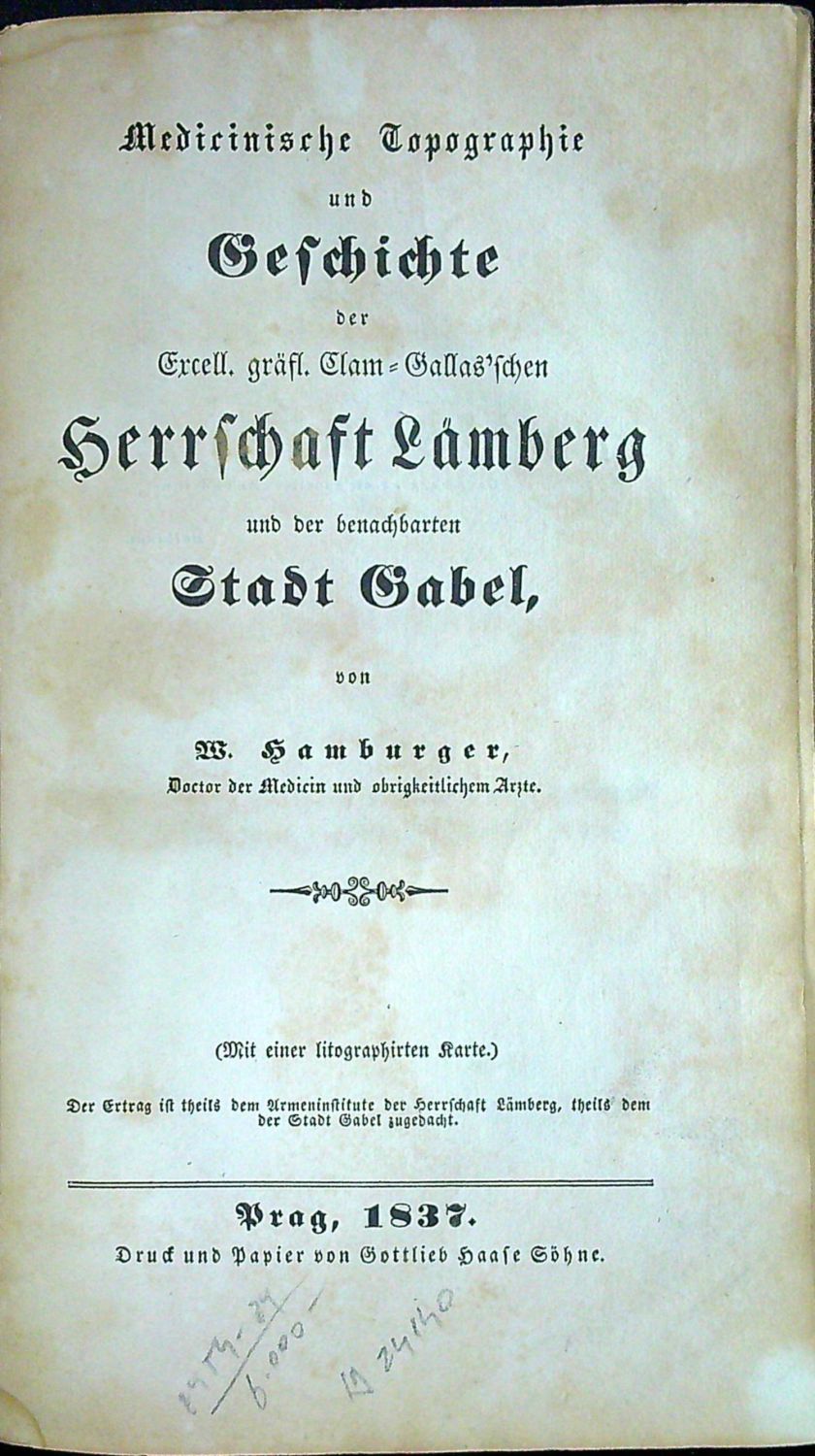 Medicinische Topographie und Geschichte der Excell. gräfl. Clam=Gallas´schen Herrschaft Lämberg und der benachbarten Stadt Gabel.