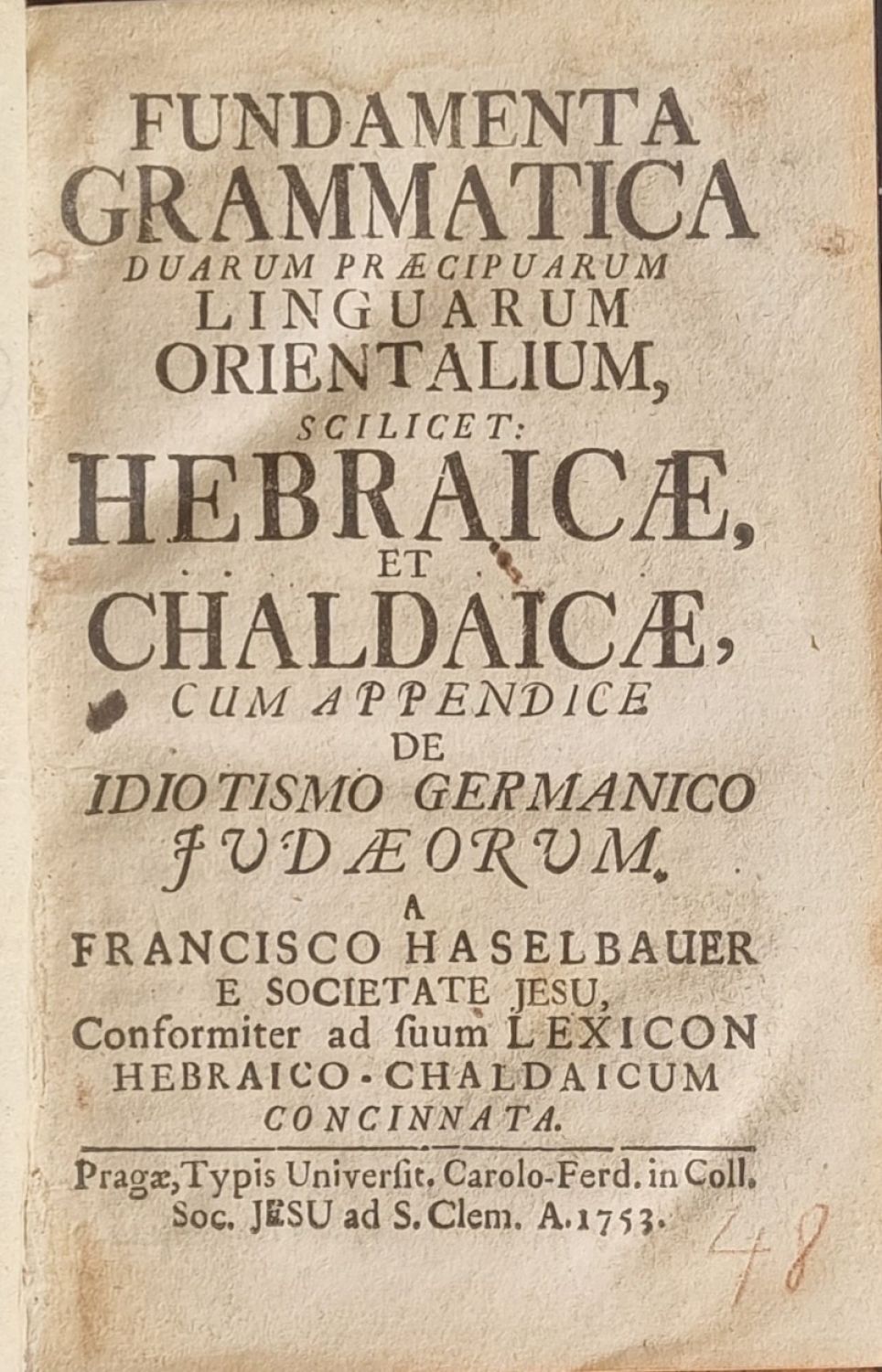 FUNDAMENTA GRAMMATICA DUARUM PRAECIPUARUM LINGUARUM ORIENTALIUM, SCILICET: HEBRAICAE, ET CHALDAICAE, CUM APPENDICE DE IDIOTISMO GERMANICO JUDAEORUM, a FRANCISCO HASELBAUER E SOCIETATE JESU, Conformiter ad suum LEXICON HEBRAICO-CHALDAICUM CONCINNATA.