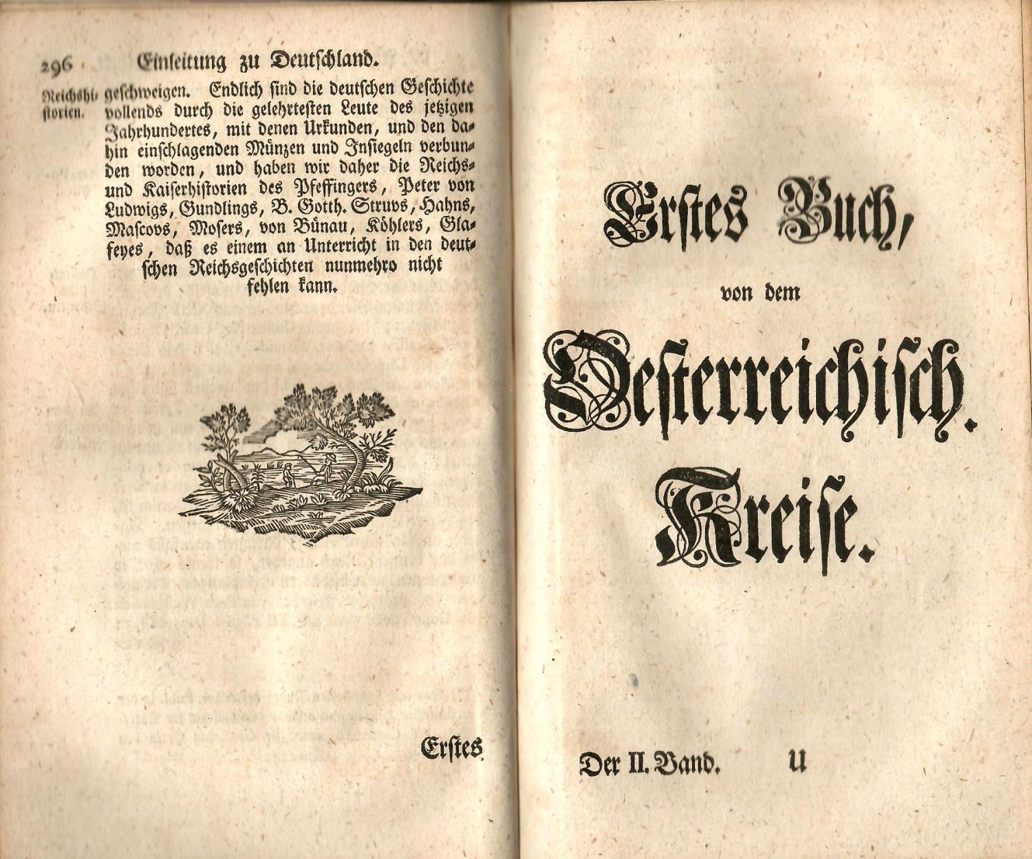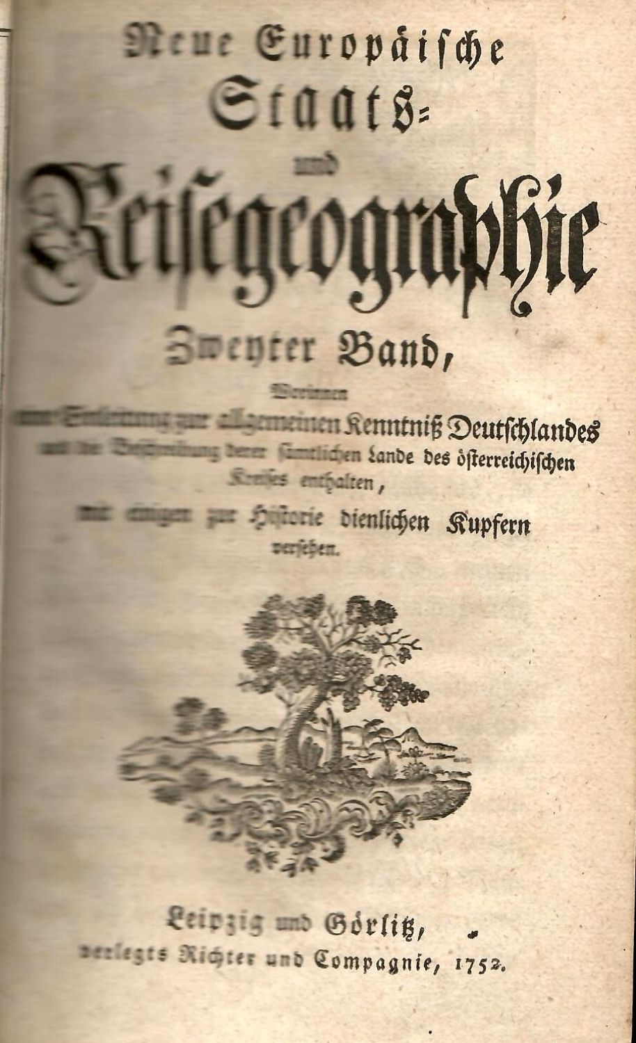 Neue Europäische Staats= und Reisegeographie. Zweiter Band, Worinnen eine Einleitung zur allgemeinen Kenntniß Deutschlandes und die Beschreibung derer sämtlichen Lande des österreichischen Kreises enthalten, mit einigen zur Historie dienlichen Kupfern versehen,