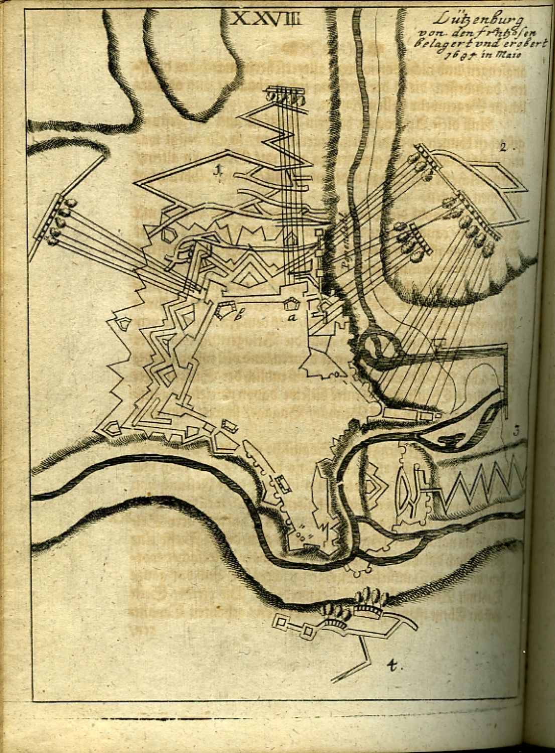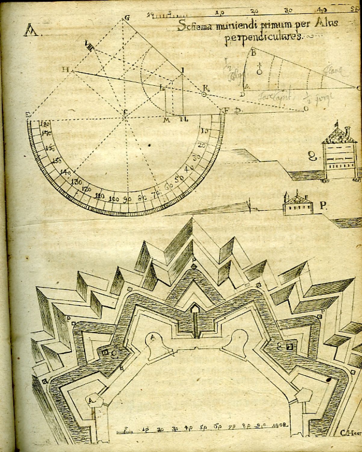| Ilustrace: | Do mědi rytý předtitul s vyobrazením opevnění, v textu prvé části 20 listů příloh, z toho 3 s početními tabulkami, ostatní s mědirytovými schematickým vyobrazením různých druhů fortifikace a nástrojů při stavbě používaných; viněty, pásové vlysy a tyče ornamentálního a rostlinného charakteru, iniciály propletené úponky ve výši 3-6 řádků, viněty. |