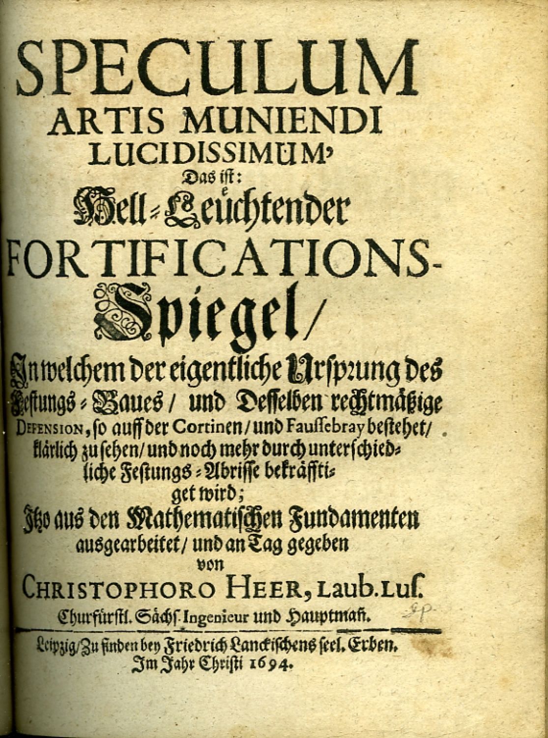 1) Heer, Christoph: SPECULUM ARTIS MUNIENDI LUCIDISSIMUM, Das ist: Hell=Leüchtender FORTIFICATIONS-Spiegel, In welchem der eigentliche Ursprung des Festungs=Baues, und Desselben rechtmäßige Defension, so auff der Cortinen, und Fauffebray bestehet, klärlich zu sehen, und noch mehr durch unterschiedliche Festungs=Abrisse bekräfftiget wird: Itzo aus den Mathematischen Fundamenten ausgearbeitet, und an Tag gegeben von ..., Leipzig, Friedrich Lanckischens Erben, 1694, [XII]-162 str. + 2 listy + 31 mědiryt. příloh, dřevořezové vlysy, iniciály propletené úponky zalomené do výše 2-5 řádků, tučně tištěné versálky, viněty, nadpisy kapitol tištěné kursivou. Na konci seznam příloh s vyobr. různých typů fortifikací, jejich umístění v krajině, nástroje, nářadí a pomůcek používané při stavbě, geometrické náčrty.<br>Obě díla jsou kompletní. Christoph Heer (1637-1701), německý inženýr a teoretik fortifikačních staveb, působil jako hlavní inženýr u saského dvora a podílel se na stavbě opevnění Mannheimu.<br>