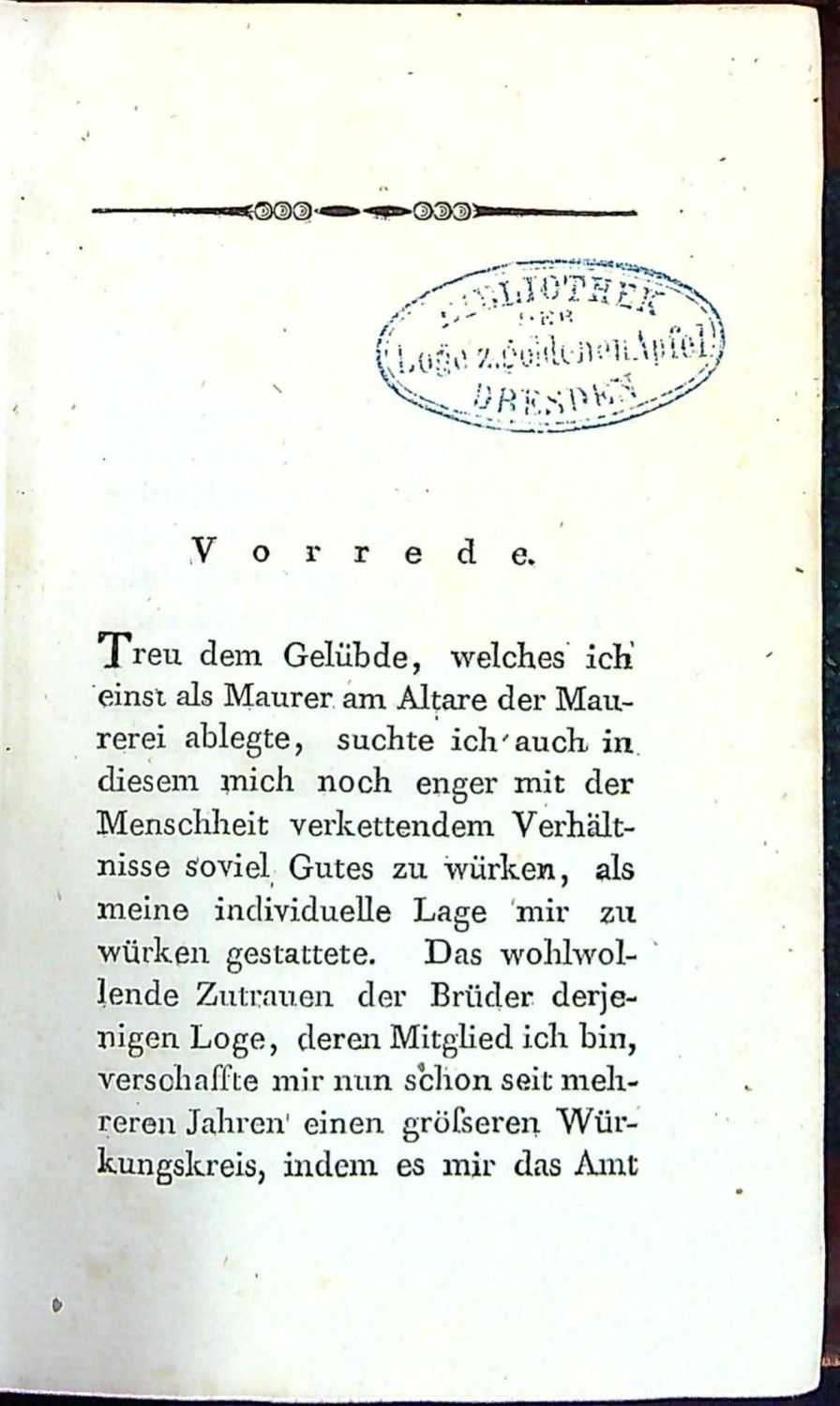 Holzmann-Bohatta III,345<br>Tištěno antikvou, v textu několik mezi titulních listů, ozdobné tyče v záhlaví jednotlivých oddílů.<br>Dobová vazba s kartonovými deskami potaženými mramorovaným papírem, kožený hřbet a nárožnice, ve hřbetu 4 vazy, přes horní a spodní pole přelepen starý pap. štítek s číslem, barvené ořízky. Na tit. listu staré vlastnické značky ve vavřínovém věnci, na tit. listu a na dalších 2 listech stará razítka drážďanské zednářské lóže "Loge z. goldenen Apfel". Na několika listech drobné hnědé skvrnky.