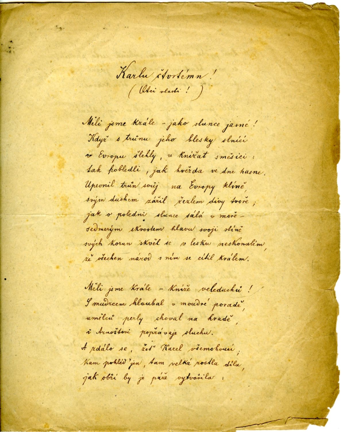 V půli přeložený, na okrajích zahnědlý, mírně pomačkaný a roztřepený dvoulist 210 x 170 mm, popsaný po třech stranách hnědým inkoustem. Nedatovaný, podepsaný rukopis básně o šesti slokách. - Jan Herben (1857 Brumovice u Hustopečí – 1936 Praha), politik, novinář, spisovatel a historik.
