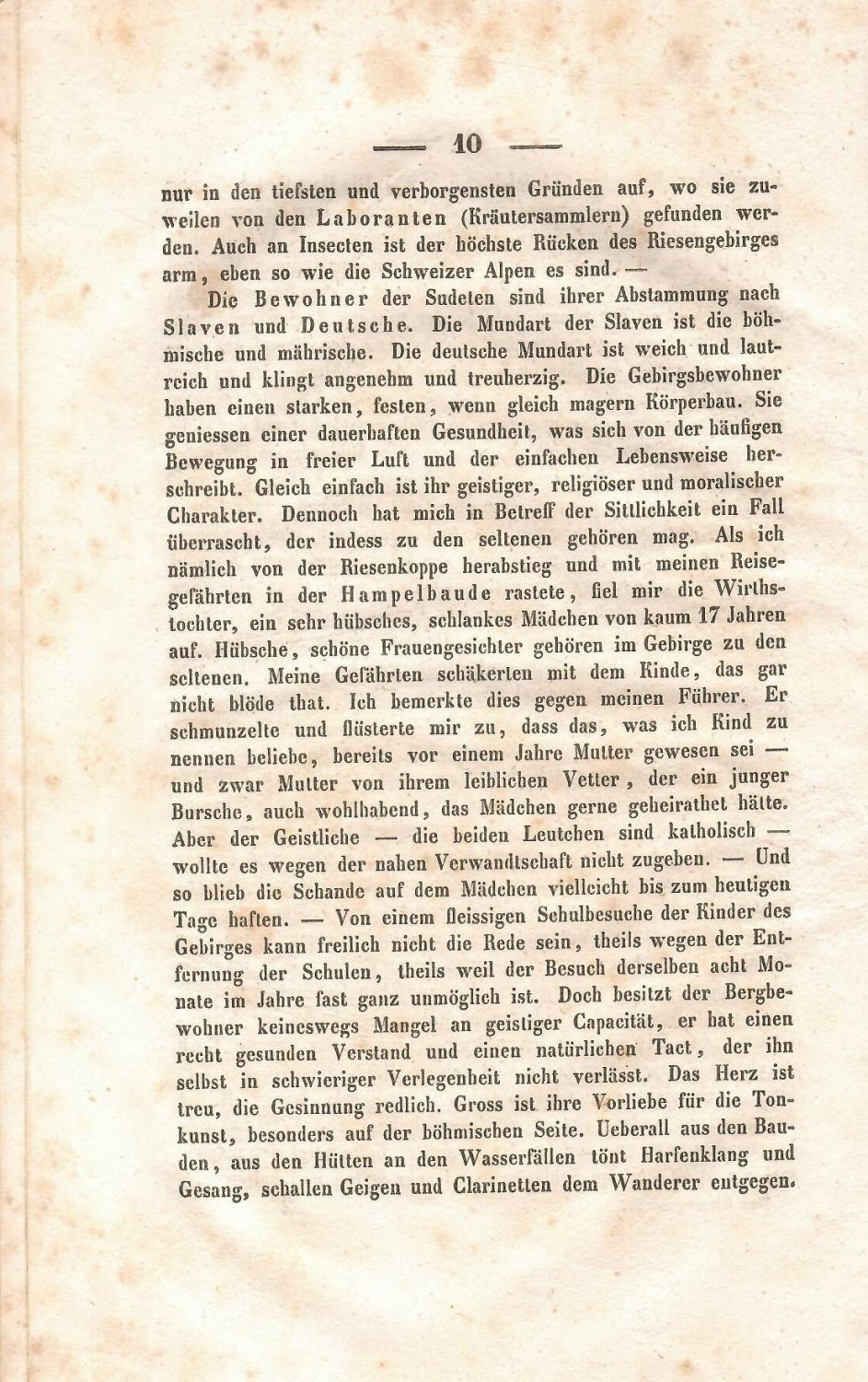 Rümann 2142; Zíbrt I, 743<br>Das malerische und romantische Deutschland, Bd. VI. Poslední kapitola knihy je věnována Praze a je doprovázena několika rytinami významných pražských památek (též starého židovského hřbitova).<br>Dobová kartonová vazba s deskami potaženými mramorovaným papírem, kožený hřbet a nárožnice, ve hřbetu pole dělená dvojitou zlacenou linkou, ve druhém a ve čtvrtém poli tlačený a zlacený název.Vazba ohmataná a odřená, při horním okraji hřbetu kůže natržená, naražené rohy a kožené nárožnice z větší části sedřené, v textu tu a tam drobné světlé mapky či skvrnky.<br>Karl Georg Herlossohn, vlastním jménem Georg Karl Reginald Herloss (1.9. 1802 Praha - 10.12. 1849 Lipsko), pocházel z pražské malostranské německé rodiny, studoval na pražské universitě filosofii, roku 1825 se přestěhoval do Lipska, kde se věnoval novinářské a literární práci. Roku 1830 založil vlastní časopis Der Komet, který redigoval až do roku 1848. V roce 1839 podnikl cestu po Slezsku a Krkonoších se zastávkou v Praze, kterou popsal v nabízené práci. Roku 1848 převzal redakci Spindlerova almanachu a plánoval své přestěhování do Prahy, ale vážná nemoc mu plány zhatila. Zemřel zcela bez prostředků v nemocnici sv. Jakuba v Lipsku. Kromě jiného parodoval i povídky ve své době velmi oblíbeného Heinricha Clarena, pod jehož jménem dvě vlastní publikoval. Velký rozruch vzbudila jeho práce "Löschpapiere aus dem Tagebuch", kterou cenzura zabavila. Několik jeho básní zhudebnil Robert Schumann. Psal výhradně německy, ale stranil Čechům, českému národu věnoval část almanachu Mefistofeles, kde srovnával slavnou českou minulost s politováníhodnou současností. Almanach byl v Rakousku zakázán.
