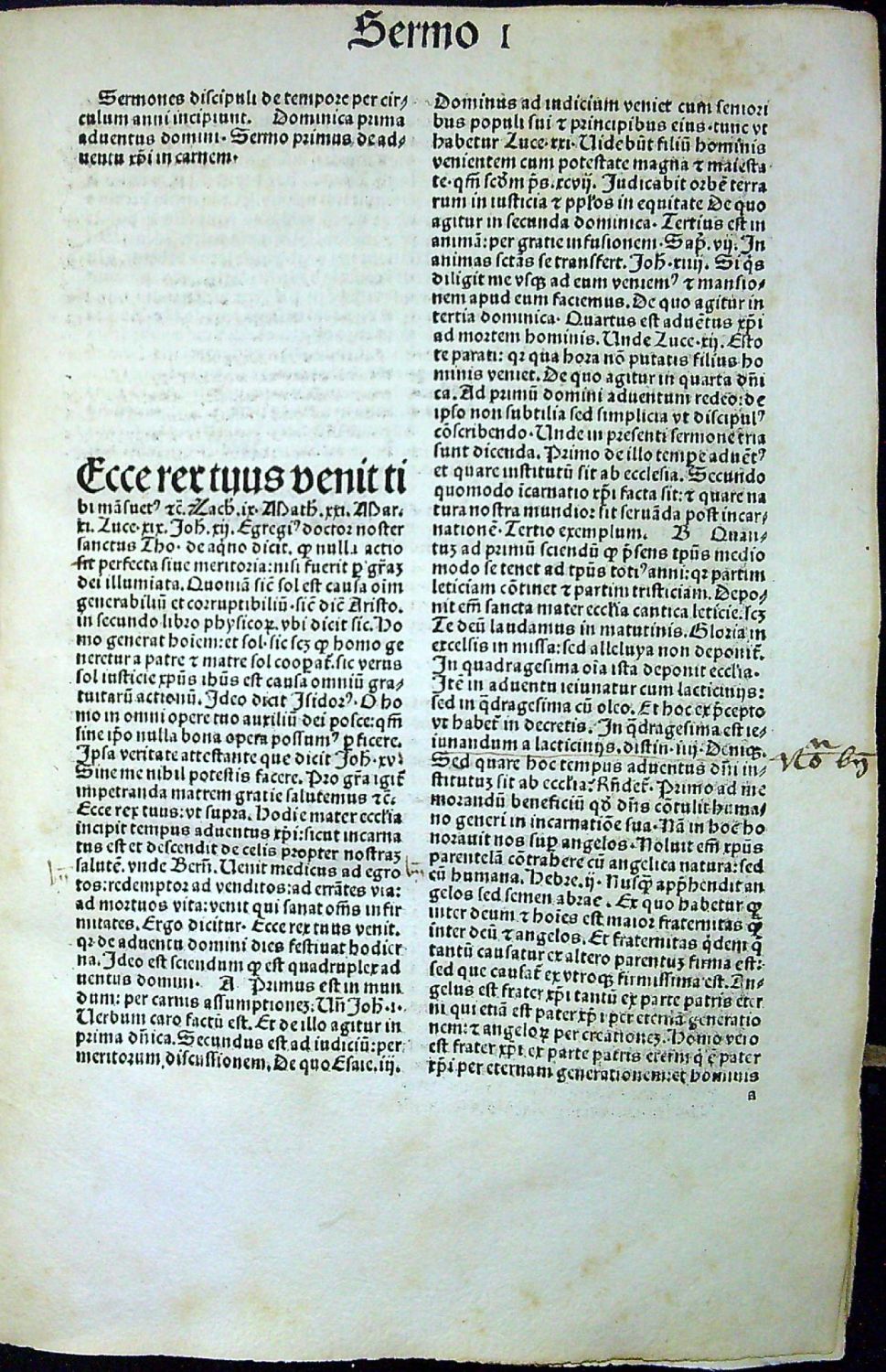 ISTC ih00113800 - eviduje 14 ex., z toho 6 nekompletních; GW 12358<br>Tištěno rotundou ve dvou sloupcích, 51 řádků, živá záhlaví, v kolofonu červeně tištěný signet tiskařův. Čtyři části - první s názvem "Sermones de tempore", druhá "Sermones de sanctis" s římsky číslovanými listy I-XLVIII + 3 nečísl. listy rejstříku, třetí část s názvem "Promptuarium exemplorum", čtvrtá "Promptuarium de miraculis" (3. a 4. nepaginovaná). <br>Pergamenová převazba (238 x 154 mm) z druhé poloviny 16. století, na obou deskách zbytky vázacích tkanic, vazba ohmataná a zašpiněná, při okrajích mírně potrhaná, na přední desce dvě drobné stopy od červotoče. Papír místy lehce zahnědlý, folio a2 přes celou šíři šikmo natržené a viditelně slepené, posledních 9 listů včetně kolofonu restaurovaných - při vnitřním horním okraji utržený papír odborně dolitý (na šesti listech ztráta mírně zasahuje do textu), knižní blok při horním okraji zčásti oříznutý po živá záhlaví. V textu řada rukopisných dobových marginálií černým perem. Na předním přídeští nalepeno vlastnické ex libris "Patrick Le Lay", na titulním listu staré razítko knihovny "Ecole Saint-Elme Arcachon".<br>Johann Herolt (cca 1390 - srpen 1468 Řezno) byl německý dominikánský kazatel známý též pod jménem Discipulus, byl jedním z hlavních představitelů nové spirituality v Německu, která kladla důraz na praktické pastorační práce. V letech 1437 až 1443 byl převorem dominikánského kláštera v Norimberku. Jeho "Sermones Discipuli" byly jednou z nejvydávanějších knih kázání v 15. století.<br> Kompletní vydání vzácného lyonského vydání, které vytiskli původem němečtí tiskaři působící v Lyonu - Nicolaus Philippi (v letech 1477-1488) a Marcus Reinhart (v letech 1477-1482).