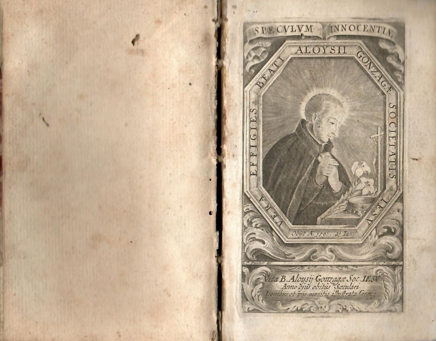 Spiegel der Unschuld Oder Englisches Leben Deß Seeligen ALOYSII GONZAGAE der Gesellschaft JEsu/ In zwey Thail entschiden/ Und Mit geistreichen Lehr=Sprüchen/ zu mehrer Nachfolg und Verehrung dises Gottseeligen Vorbilds.