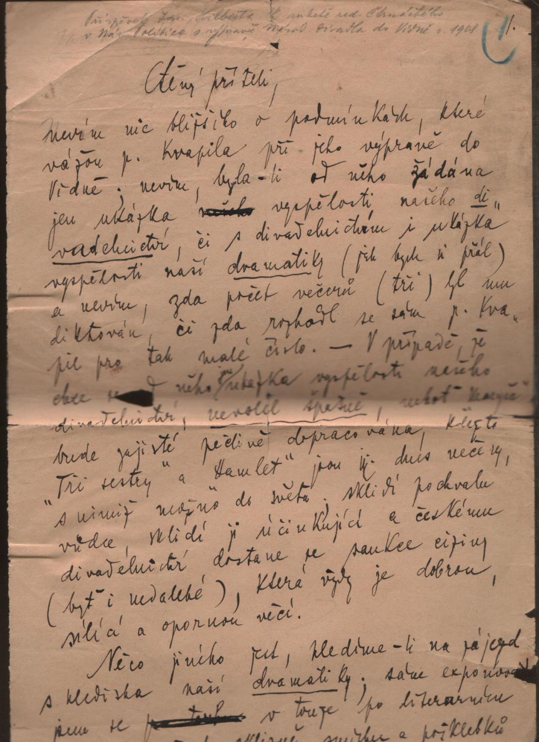 Perem psaný rukopis na líci dvou listů o rozměru 340x210mm. Rukopis je příspěvkem Jaroslava Hilberta k anketě redaktora Čtrnáctého v Národní politice o výpravě Národního divadla do Vídně roku 1908. Prvý list je v půli přeložený, místy potrhaný a na jednom místě proděravělý. Druhý list je v půli přetržený.