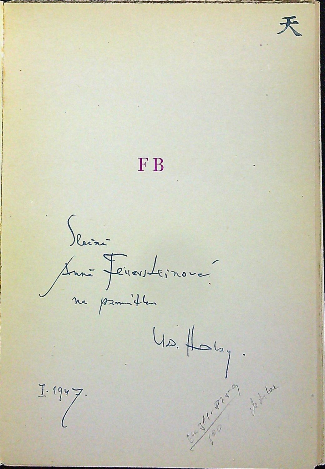 Graficky upravil F. Muzika a písmem Baskerville vytiskla Průmyslová tiskárna. Na předním listu se značkou nakladatelství rukopisná dedikace autorova "Slečně Anně Feuersteinové na papátku Vlad. Holan I. 1947". - Anna Feuersteinová (1897 Loučeň - 1981 Praha) sestra a asistentka architekta a výtvarníka Bedřicha Feuersteina.