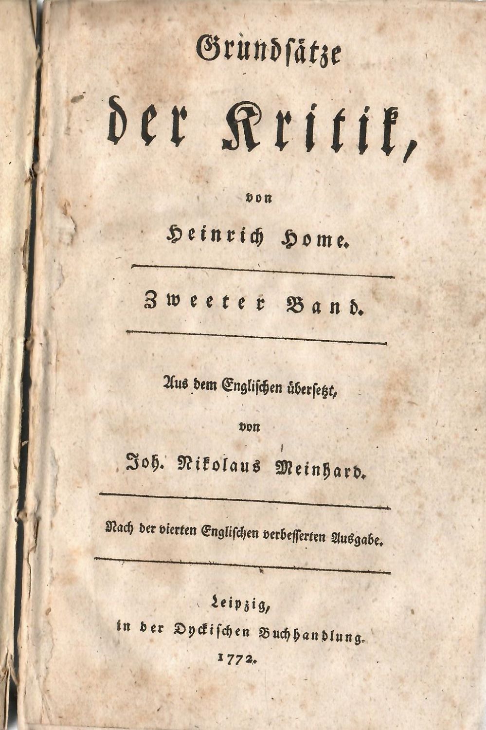 Tištěno švabachem, živá záhlaví, tištěné poznámky pod čarou.<br>Dobová kartonová vazba potažená světle modrým papírem, barvené ořízky. Vazba zašpiněná, pap. pokryv místy potrhaný, u prvního svazku ve hřbetu z větší části chybí. Papír místy zahnědlý, tu a tam drobné hnědé skvrny, tit. list 2. svazku uvolněný z knižního bloku. - Z anglického 4. vydání do němčiny přeložil Johann Nikolas Meinhard.<br>Henry Home (1696 Berwickshire - 27.12. 1782 Edinburgh) skotský spisovatel, filosof a soudce, ústřední postava skotského osvícenství, zakládající člen Filosofické společnosti v Edinburghu.