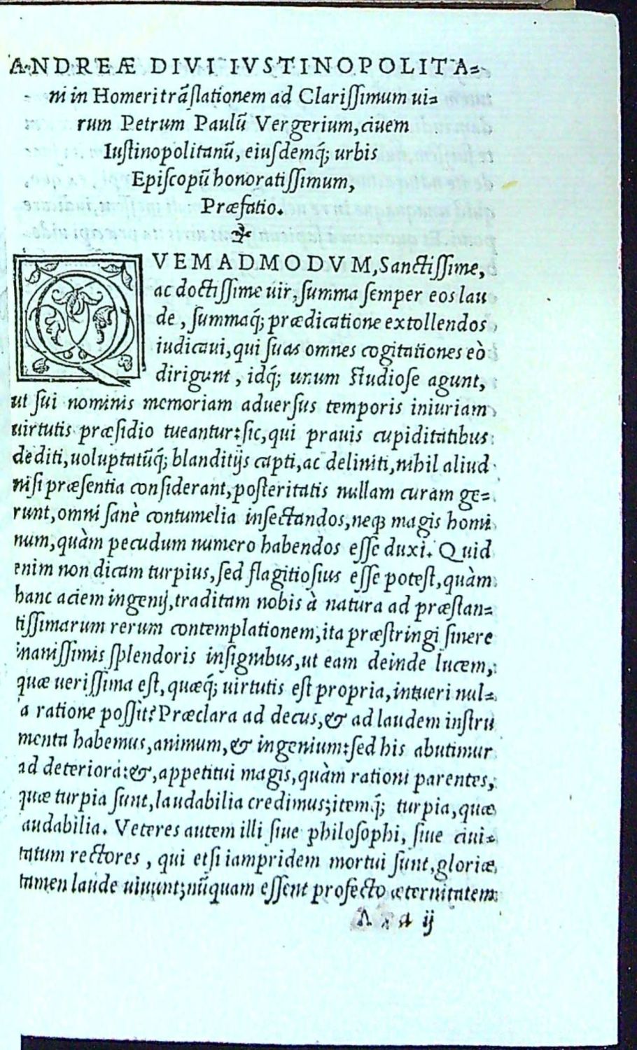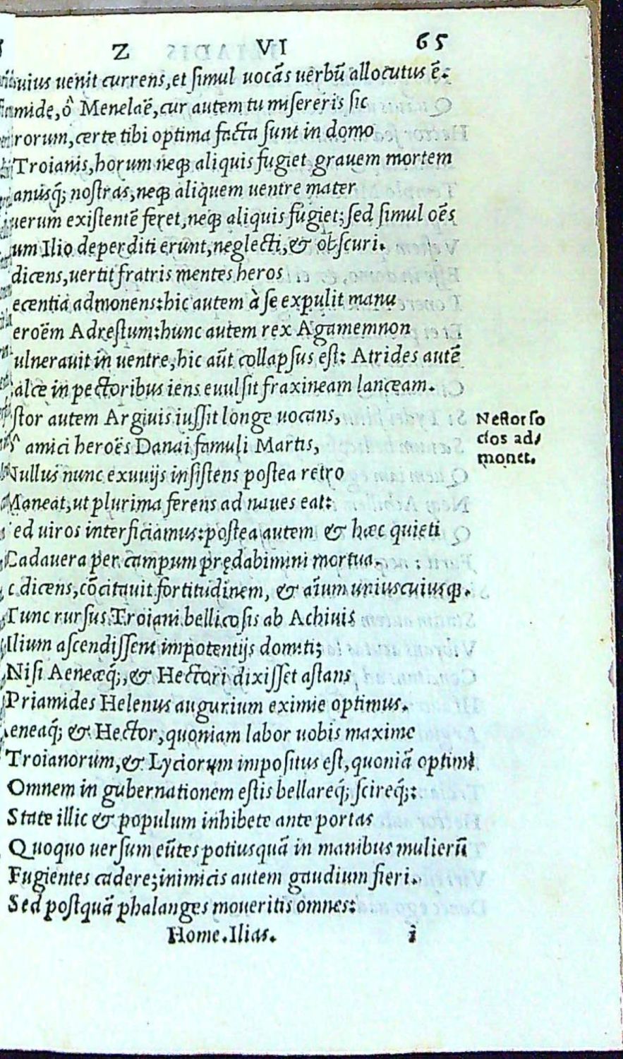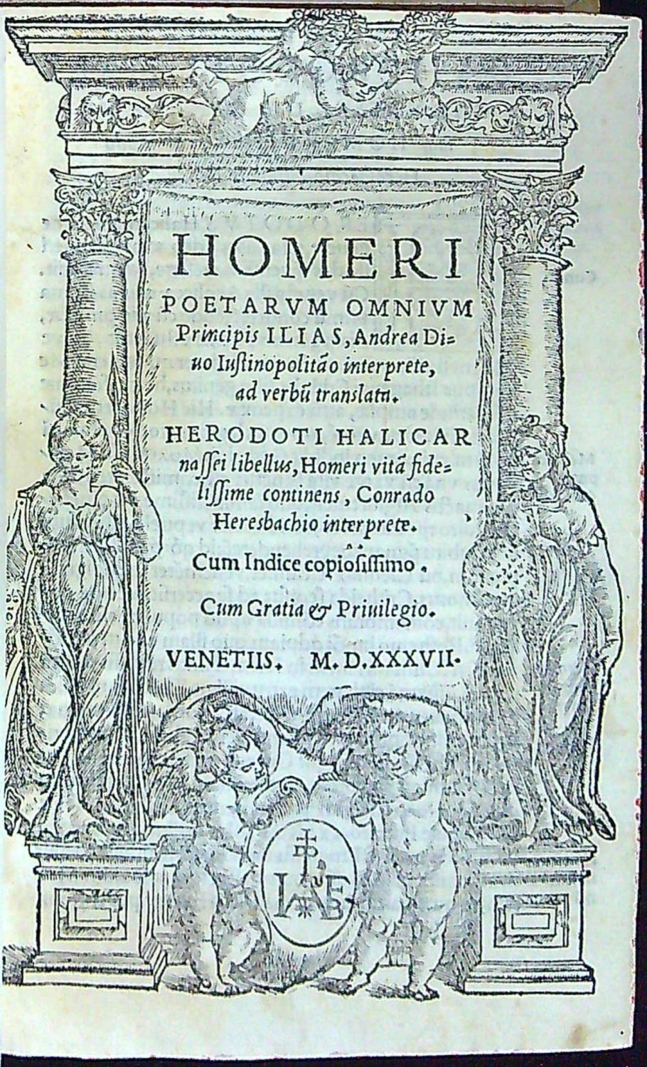 Adams H,770 (Ilias)<br>Titulní list 1. svazku "HOMERI POETAE CLARISSIMI Odyssea, Andrea Diuo Iustinopolitano interprete, ad verbu[m] translata. EIUSDEM BATRACHOmyomachia, id est, Ranaru[m] et muriu[m] pugna, Aldo Manutio interp[re]te. EIVS DEM HYMNI DEO rum. XXXII. Georgio Dartona Cretense interprete". Titulní list 2. sv. "HOMERI POETARVM OMNIVM Principis ILLIAS, Andrea Diuo Iustinopola[n]o intereprete, ad verbu[m] translata. HERODOTI HALICAR nassei libellus, Homeri vita fidelissime continens, Conrado Heresbachio interprete. Cum Indice copiosissimo". Titulní listy zakomponované v renesanční borduře, v textu řada konturových a plných iniciál zasazených v jednoduchém dvojitém rámečku na ilustrativním, či florálním pozadí, zalomených do výše 4-6 řádků, v obou svazcích signety I. A. Burgofrancha. Živá záhlaví, tištěné poznámky po stranách, v Odyssee od folia 214 interpretace Homéra od Alda Manutia. Do latiny přeložil Andrea Diuo. <br>Pergamenové vazby z 18. století, ve hřbetu 3 vazy, v prvním poli černým perem napsaný název, stříkané ořízky.<br>Andreas Divus (italsky Andrea Divo Giustinopolitano či do Capodistria) renesanční učenec 16. století, latinská podoba jeho příjmení Justinopolitano naznačuje jeho původ v Kopru (Justinopolis), dnes na území Slovinska, jinak se o jeho životě ví velmi málo. Jeho překlady Homéra do latiny jsou takřka doslovné a jedná se o první tištěné latinské překlady.