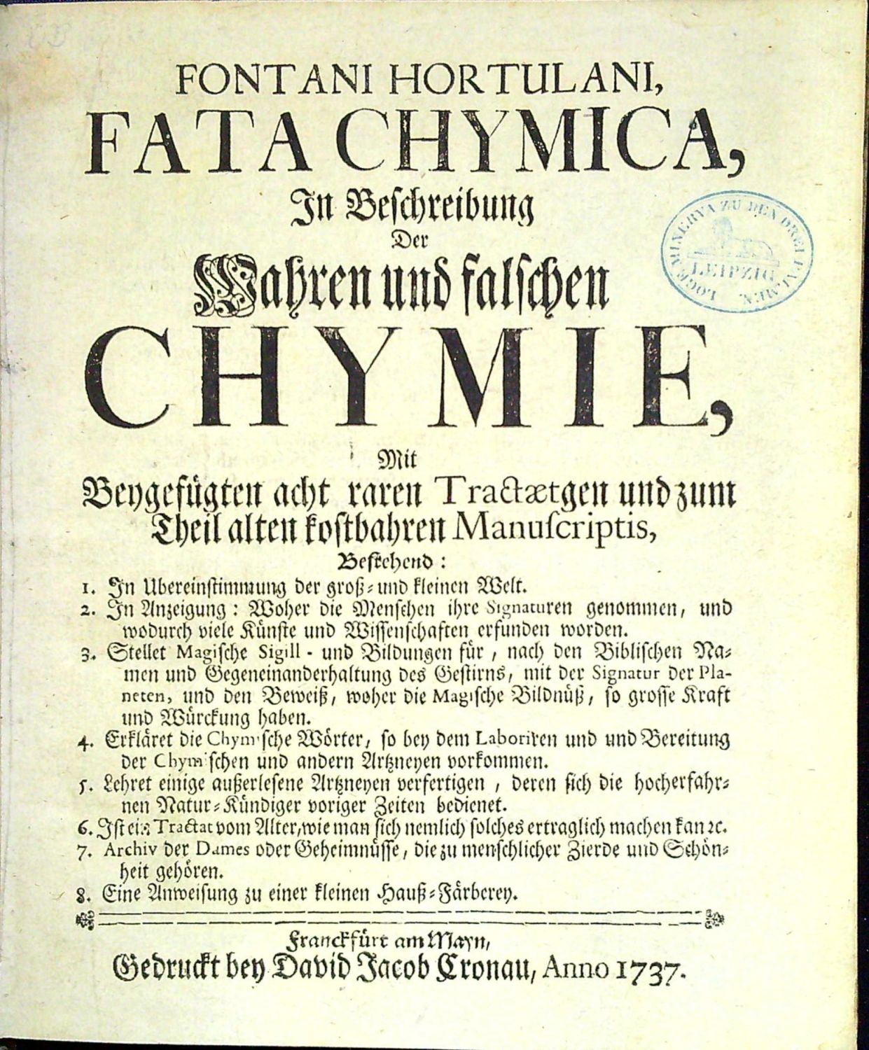 FATA CHYMICA, In Beschreibung Der Wahren und falschen CHYMIE, Mit Beygefügten acht raren Tractaetgen und zum Theil alten kostbahren Manuscriptis, Bestehend: 1. In Ubereinstimmung der groß = und kleinen Welt. 2. In Anzeigung: Woher die Menschen ihre Signaturen genommen, und wodurch viele Künste und Wissenschaften erfunden worden. 3. Stellet Magische Sigill - und Bildungen für, nach dem Biblischen Namen und Gegeneinanderhaltung des Gestirns, mit der Signatur der Planeten, und die Beweiß, woher die Magische Bildnüß, so grosse Kraft und Würckung haben. 4. Erkläret die Chymische Wörter, so bey dem Laboriren und Bereitung der Chymischen und andern Artzneyen vorkommen. 5. Lehret einige außerlesene Artzneyen verfertigen, deren sich die hocherfahrnen Natur = Kündiger voriger Zeiten bedienet. 6. Ist ein Tractat vom Alter, wie man sich nemlich solches ertraglich machen kan etc. 7. Archiv der Dames oder Geheimnüsse, die zu menschlicher Zierde und Schönheit gehören. 8. Eine Anweisung zu einer klein