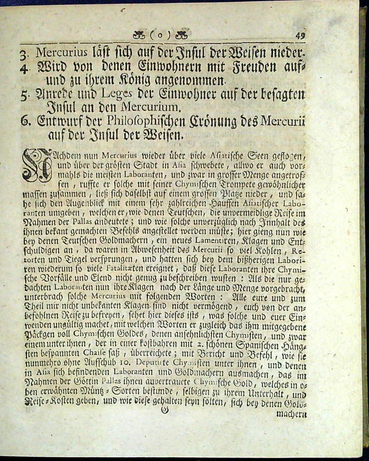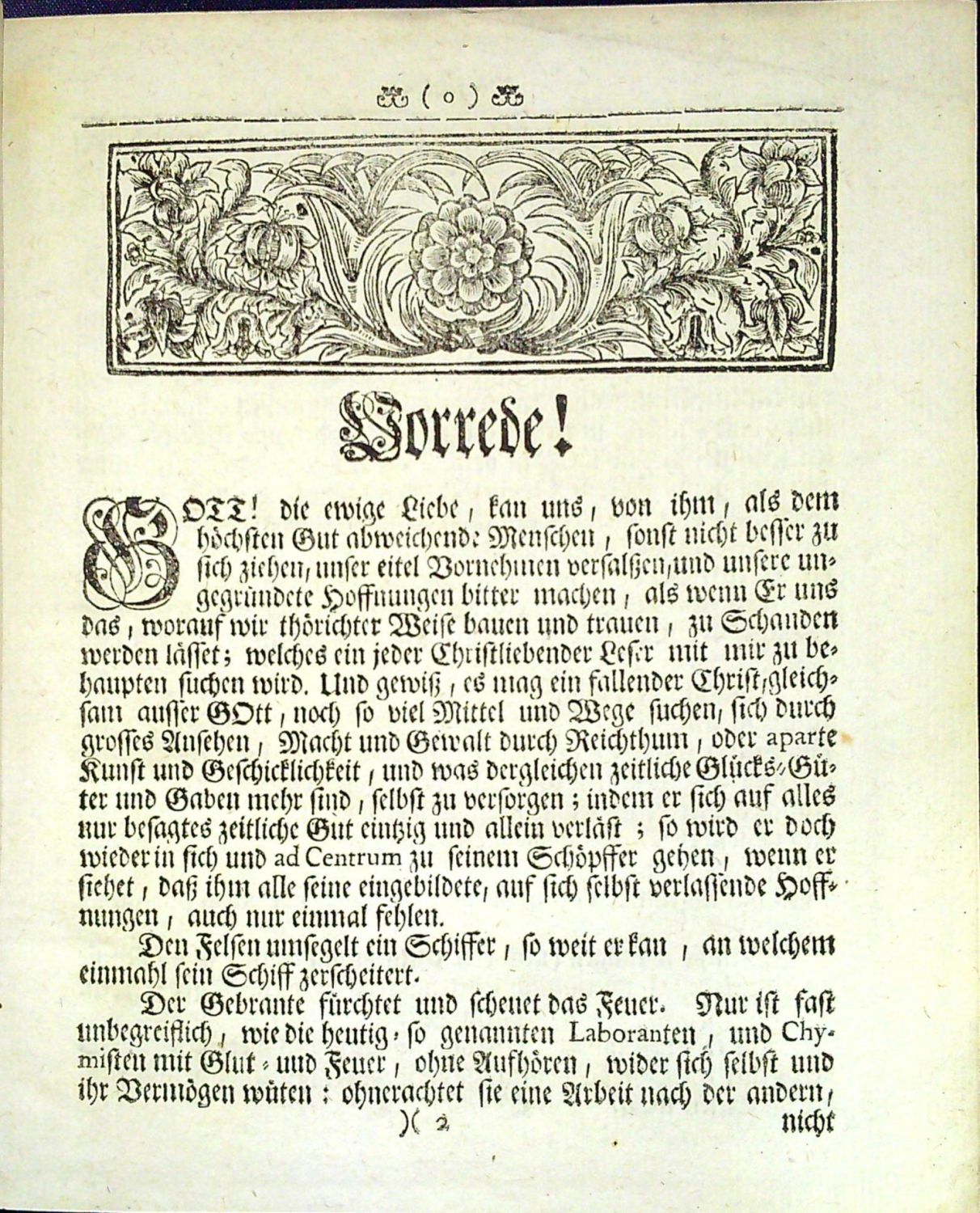Ferchl 250; Fergusson I,422 (uvádí vydání z roku 1740 vydané v Casselu, v poznámce zmiňuje vydání z roku 1737, které na straně 666 uvádí kniha "Beytrag zur Geschichte der höheren Chemie" vydaná roku 1785)<br>Ve front. alegorická mědirytina od Petera Fehra zobrazující v popředí u stolu rozmlouvající božstva (Pallas, Minervu a Apollona), v pozadí za stolem bohyni Ceres, alchymistické symboly a snad další božstva, po straně zástup vzdělanců a na vyvýšeném trůnu Zeus, úplně v pozadí fontány a palác. Vstupní pásový vlys rostlinného ornamentu ve dvojitém jednoduchém rámečku, viněty, tyče z rostlinných ornamentů, plné iniciály propletené úponky ve výši 3-4 řádků, uprostřed horního okraje stran drobné tiskařské ozdůbky od sazby oddělené jednoduchou linkou. Německý text gotikou, latinská slova a názvy antikvou. Na úvodních 7 listech předmluva autorova datovaná 1737, od strany 1 po stranu 110 autorův text, na straně 111 mezititul "Erster TRACTAT. Arnoldi de Villa Nova", na straně 393 "Sechster TRACTAT. Vom Alfer", na straně 448 "Der siebende TRACTAT", na straně 457 "Der achte TRACTAT".<br>Dobová pergamenová vazba, na předním přídeští nalepeno mědirytinové ex libris z 18. století, na přední předsádce razítko "Hauptkatalog" a tužkou psané knih. číslo, na titulním listu razítko zednářské lóže Minerva v Lipsku "Loge Minerva zu den drei Palmen Leipzig".<br>Pozoruhodné dílo o alchymii, jejích konkordancích, alchymistických signaturách, magických symbolech, alchymistických laboratořích, elixírech, barvách .... z pera autora skrývajícího se za pseudonymem Fontanus Hortulanus (Ferchl nesprávně tvrdí, že se jedná o anglického alchymistu Garlanda). V prvé části autor píše o bohyni moudrosti Pallas jak se ve spolupráci s bohyněmi Minervou, Ceres a bohem Apollonem snaží zastavit různé škodlivé pokusy a dále zkoumá různé pravdivé i nepravdivé informace z oblasti chemie. "Jedno z poeticky nejnápaditějších alchymistických děl s fiktivním rámcem a dokonce s utopickou epizodou" (Harold Jantz).