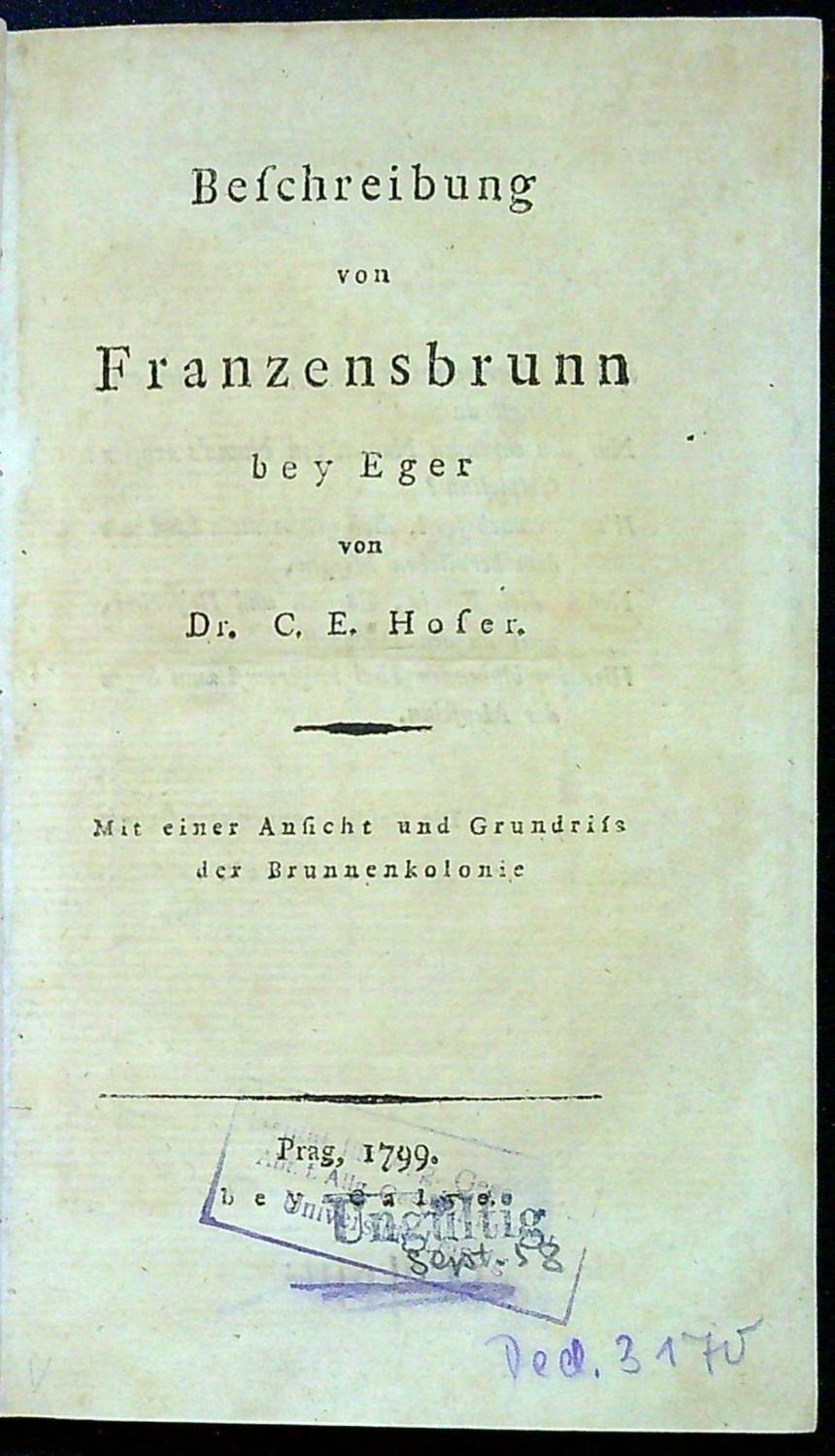 Hirsch III,307; Voit "Bohemica" 353; BCBT 08675<br> Tištěno antikvou, ve front. lept (126 x 80 mm) s pohledem na Františkovy Lázně a rytým nápisem "Ansicht des K. Franzensbades aus dem Hohlwege bey Schlada". Na konci knihy vyklápěcí plán, lept (130 x 310 mm) se schematickým vyobrazením léčebných pramenů a rytým nápisem "Situationsplan von der Anlage des Kaiserfranzensbades", sign.: "Jo. Berka sc.". Mezi stranou 42-43 rozkládací tabule.<br>Dobová kartonová vazba s koženým hřbetem a nárožnicemi, ve druhém poli hřbetu dobový kožený štítek s tlačeným a zlaceným názvem, jednotlivá pole hřbetu členěná dvojitou tlačenou a zlacenou linkou, zeleně barvené ořízky. Na předním přídeští nalepeno staré ex libris "Leipziger Stadtbibliothek", na tit. listu razítko lipské universitní knihovny a razítko "neplatné", na straně 99 při dolním okraji razítko stejné instituce. Front. zčásti uvolněný od knižního bloku, plán při vnitřním okraji u hřbetu lehce zašpiněný.<br>Josef Karel Eduard Hoser (30.1. 1770 Ploskovice - 22.8. 1848 Praha), lékař, botanik a národopisec. Lékařskou praxi provozoval v Praze a byl osobním lékařem arcivévody Karla.
