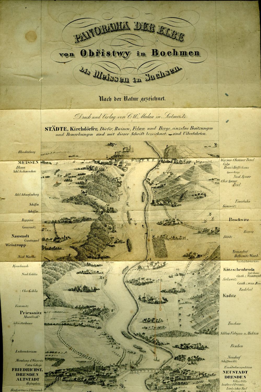 Holzmann/Bohatta VII, 9501<br>Rohy naražené, spodní vpředu ulomený, listy velmi silně zahnědlé; na přední předsádce starý vlastnický přípis inkoustem a knihovnická signatura modrou tužkou, na tit. listu další signatury a tři stará razítka ústeckého Spolku pro péči o zdraví, jedno z nich i místy v textu. + Litografované "Panorama der Elbe von Obřistwy in Boehmen bis Meissen in Sachsen. Nach der Natur gezeichnet. Druck und Verlag von C. W. Medau in Leitmeritz" 241 x 20,5 cm, podlepené novým plátnem, srolované a ukončené dřevěnými úchyty, se stopami po mnohonásobném přeložení a v horní části mírně zahnědlé.
