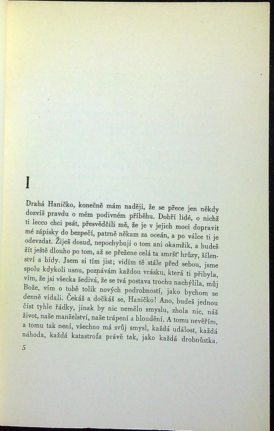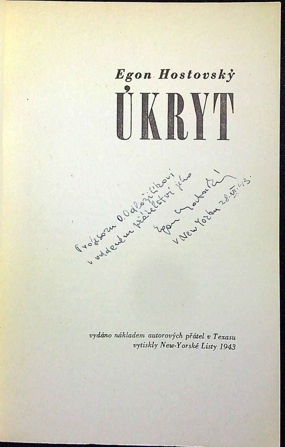 Vytiskly New-Yorské listy. Na titulním listu rkp. dedikace autorova: "Profesoru O. Odložilíkovi v oddaném přátelství jeho Egon Hostovský v New Yorku 28.XII, 43".