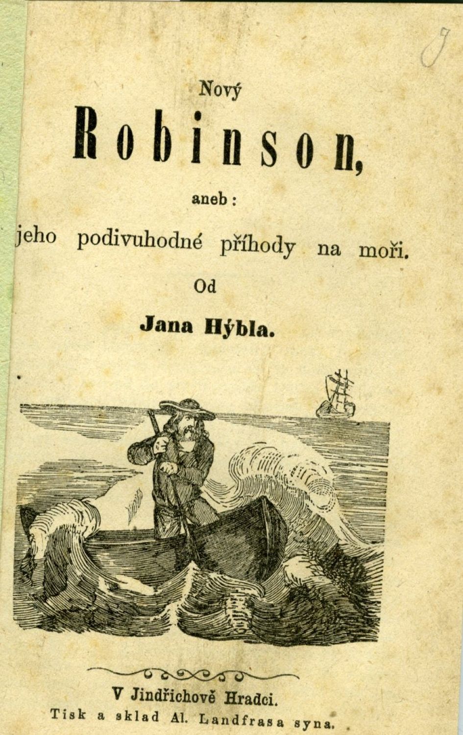 Český text antikvou, arabské číslování stran uprostřed horního okraje, na tit.listu dřevořez Robinsona ve člunu, v textu další tři ilustr. dřevořezy.
