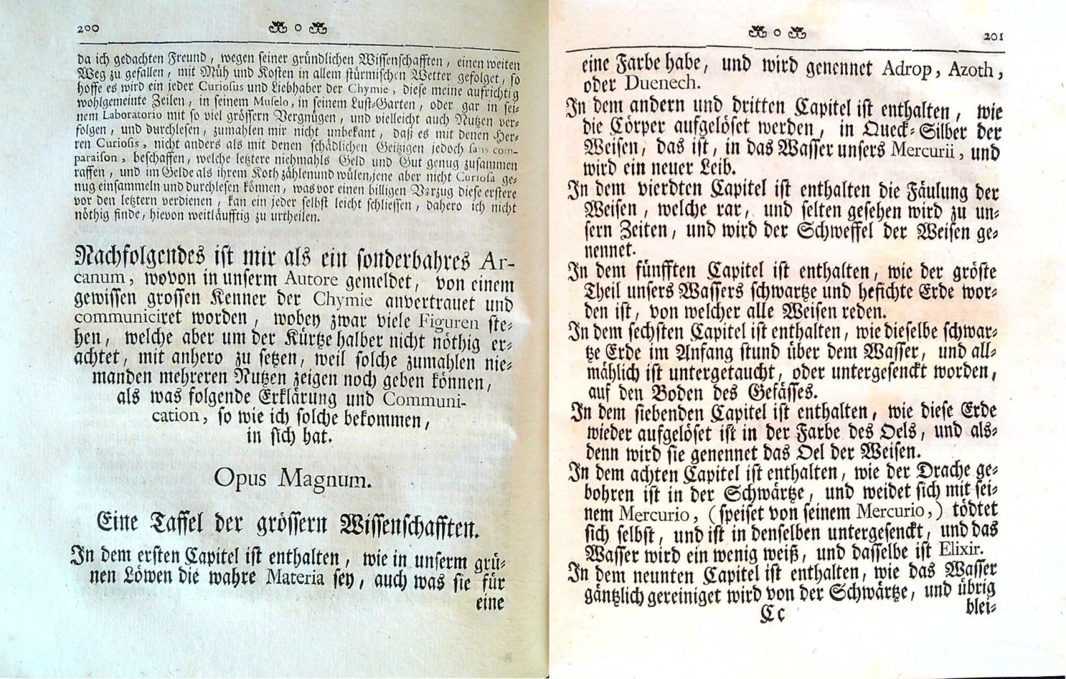 Kartonová vazba z přelomu 18. a 19. století, na hřbetu patrná místa po dvou pap. štítcích, mírně zašpiněná a ohmataná, lehce naražené rohy. Měděrytinový celostr. předtitul s vyobrazením chemické laboratoře, ve které pracuje několik mužů, někteří z nich pokuřují z dýmky. Nahoře je nápis "En! Errantes" (v ozdobném rámečku rostlinného dekoru), dole pod rytinou "Eunt, quaitur, non qua eundum est via", mezi str. 88-89 celostr. měděryt. tabule s horoskopem. V textu ozdobné dřevořezové iniciálky ve výši čtyř řádků, dřevořezové viněty, ozdobné lišty rostlinného dekoru, živá záhlaví, ozdůbky. Ve stavu velmi dobrém.<br> První, velmi vzácné vydání díla chemicko-alchymistického obsahu, které je napsáno formou napínavých vyprávění o rozličných transmutacích, chemických přeměnách, experimentech a léčebných postupech. Například na straně 21 varuje autor před pitím špatné vody, voda je dobrá leda tak pro zvířata a v protikladu k tomu vyzdvihuje pití dobrého piva a vína, které člověku dodávají sílu. Druhé vydání knihy vyšlo roku 1752 v Lipsku pod titulem "Falscher und wahrer Lapis Philosophorum,......."<br>4 Bl.; 416 S., 1 Bl. + 2 Kupfertafeln. Etwas späterer Pappband mit bestossenen Ecken und Spuren nach entfernten Rückenschildern.