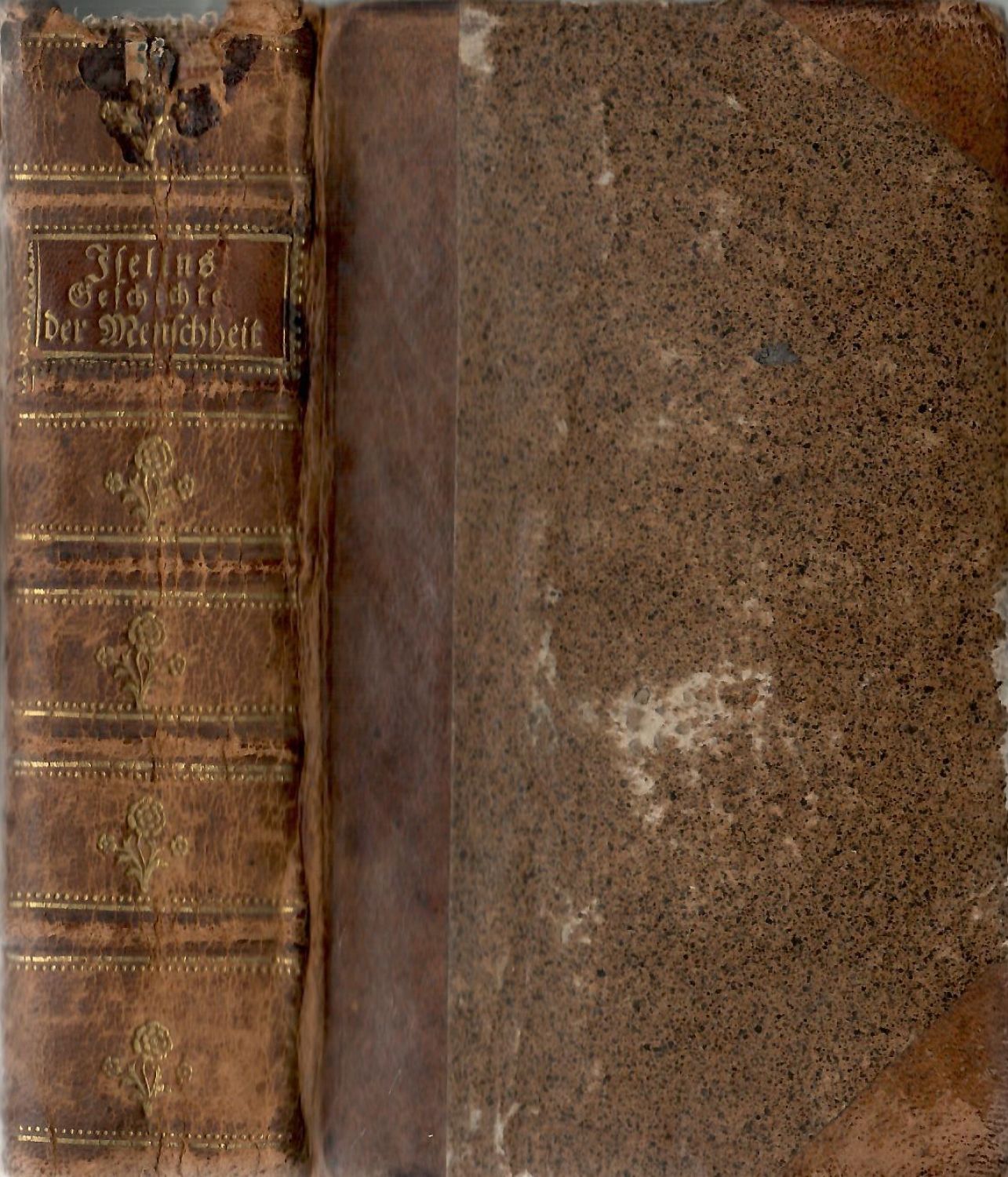 Tištěno švabachem, latinský text antikvou. Arabská paginace stran uprostřed horního okraje mezi obrácenými kulatými závorkami, tištěné poznámky pod čarou.<br>Dobová vazba s deskami potaženými olejovým papírem, koženým hřbetem a nárožnicemi, ve hřbetu 5 vazů, ve druhém poli kožený štítek s tlačeným a zlaceným názvem, v ostatních polích olemovaných linkami tlačený a zlacený rostlinný ornament, mramorované ořízky, na přídeštích a předsádkách dobový tragantový papír zdobený rostlinným ornamentem. Vazba mírně ohmataná, lehce naražené rohy, při horním okraji hřbetu natržená s chybícím kouskem kůže. Na předním vakátu staré, nevyplněné knih. razítko.<br>Isaak Iselin (7.3. 1728 Basilej - 15.7. 1782 Basilej), významný švýcarský filosof se zaměřením na historii a politiku, filantrop a osvícenec. Roku 1756 se radním v Basileji. Byl také spoluzakladatelem Helvétské společnosti. Nabízená kniha vyšla poprvé roku 1764 a patří k prvním důležitým dějinám lidstva v německém jazyce.