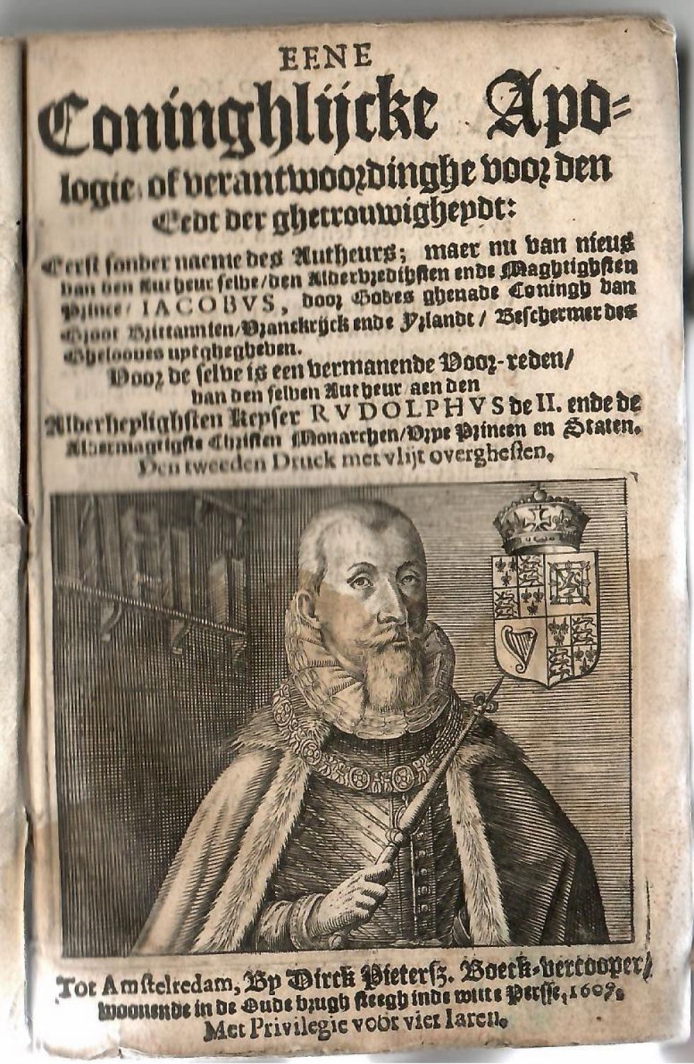 Na titulním listu mědirytina s vyobrazením panovníka, tištěno gotikou v holandštině, místy antikvou, živá antikou tištěná záhlaví, tištěné poznámky v latině po stranách. <br>+ přívazek: "Tegen een driedubbelde Quast Een driedubbelde Beytel. Dat ist, APOLOGIE OFT Verantwoordinghe, voor den Eedt der ghetrouwichey, teghen twee Bullen des Paus Pauli des vijfden, teghen eenen Brief des Cardinaels Bellarmini, aen Georg Blacwel Opperpriester corteling geschreven. Getrouwelijck upt des Conings (Jacobus I.) Copije overgheset". Amsterdam, Dirck Pietersz, [1609], 123-[III - poslední dvě nepotištěné], na tit. listu dřevořezová viněta, vstupní dřevořezový vlys a konturová iniciála na rostlinném pozadí ve výši 6 řádků, tištěno gotikou, místy antikvou v holandštině, tištěné poznámky po stranách, živá záhlaví.<br>Dobová pergamenová holandská vazba, na přední a zadní desce původní kožené vázací tkanice (pří spodním okraji zachovalé, při horním jedna chybí a druhá torsální), ve hřbetu tři vazy, barvené ořízky. Vazba ohmataná a zašpiněná, při spodním okraji hřbetu pergamen natržený, na zadní desce při spodním okraji lehce okousaný, na prvních 14 stranách prvého titulu ve spodní polovině stran hnědé mapy od vlhkosti, papír místy zahnědlý.<br>Jakub I. Stuart (19.6. 1566 Edinburgh - 27.3- 1625 Londýn), syn Marie Stuartovny, roku 1667 korunován na skotského krále, roku 1603 na anglického.