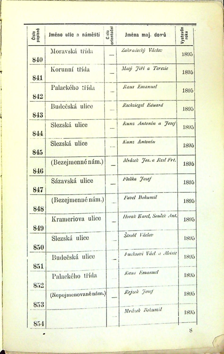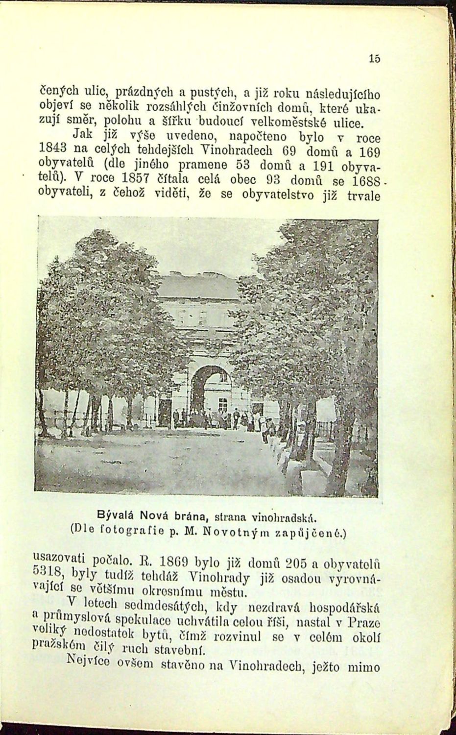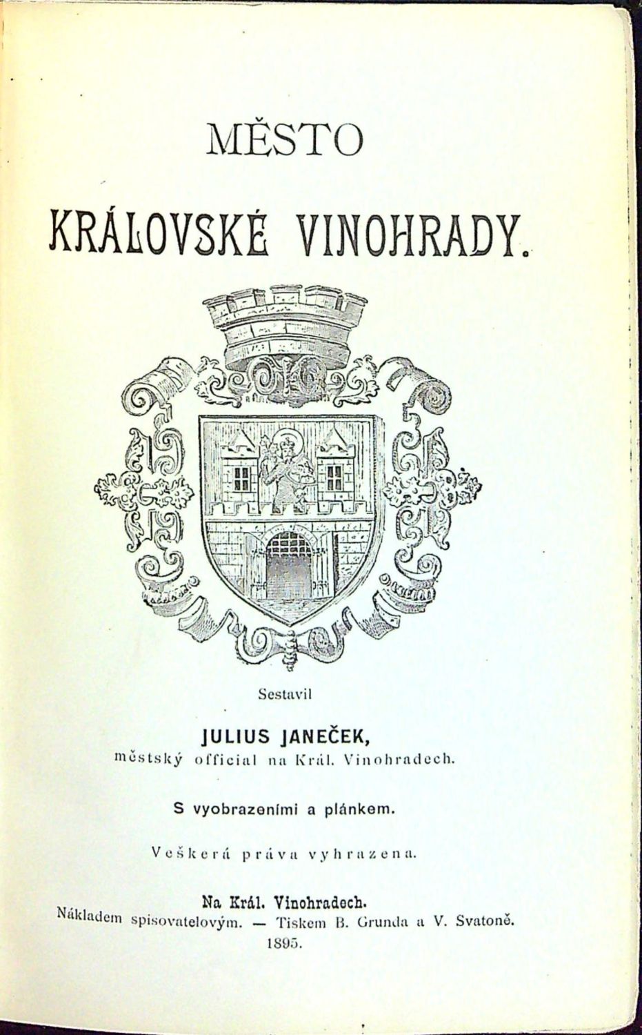 Na tit. listu znak Král. Vinohrad, konturové iniciály na ornamentálním pozadí zalomené do výše 3-4 řádků, v textu fotograf. vyobrazení různých vinohradských pamětihodností, za paginovanou částí mezititul "Seznam domů a ulic města Král. Vinohradů" a na dalších 36 nepag. listech seznam celkem 860 domů s uvedením jejich majitele. Na konci rozkládací plán města Král. Vinohrad. Mezi str. 56-57 rozkl. příloha se sazbou hřbitovních poplatků.<br>Dobová plátěná vazba, na přední desce tlačený název a tlačený, zlacený znak města, vazba ohmataná, zlacení znaku vybledlé, několik posledních listů uvolněných z knižního bloku.