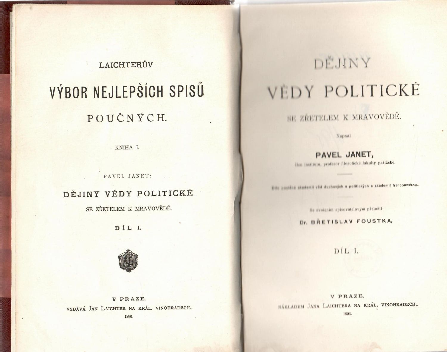 Dobová individuální vazba s kartonovými deskami potaženými olejovým papírem a s vínově červeným koženým hřbetem a nárožnicemi, ve hřbetu 5 vazů, ve druhém poli tlačené a zlacené jméno autora, ve čtvrtém poli tlačené a zlacené číslo dílu, v poli pátém tlačený a zlacený věcný název knihy. Na přední i zadní desce zlacené linky, zlacená ořízka.<br>Na přídeští prvního dílu vlepeno Ex libris Vilém Wodák, za zadním přídeští vlepen text, který pojednává o Paulu Janetovi. Na posledním listu prvního dílu kulaté razítko Lidová knihovna v Jihlavě.<br>Hřbety obou dílů lehce vybledlé, rohy mírně naraženy.