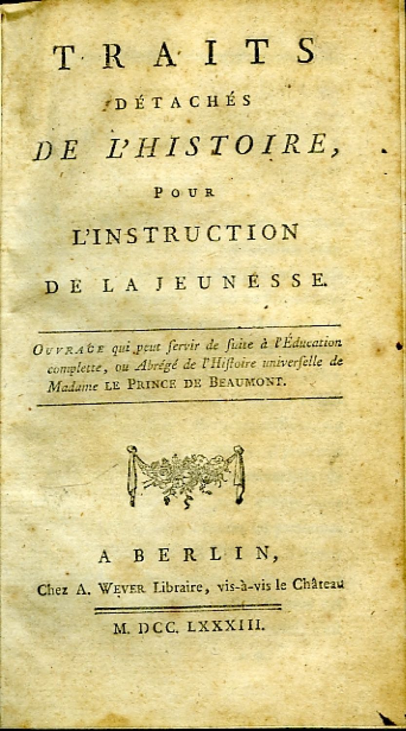 TRAITS DÉTACHÉS DE L´HISTOIRE, POUR L´INSTRUCTION DE LA JEUNESSE. OUVRAGE qui peut servir de suite à l´Éducation complette, ou Abrégé de l´Histoire universelle de Madame LE PRINCE DE BEAUMONT.
