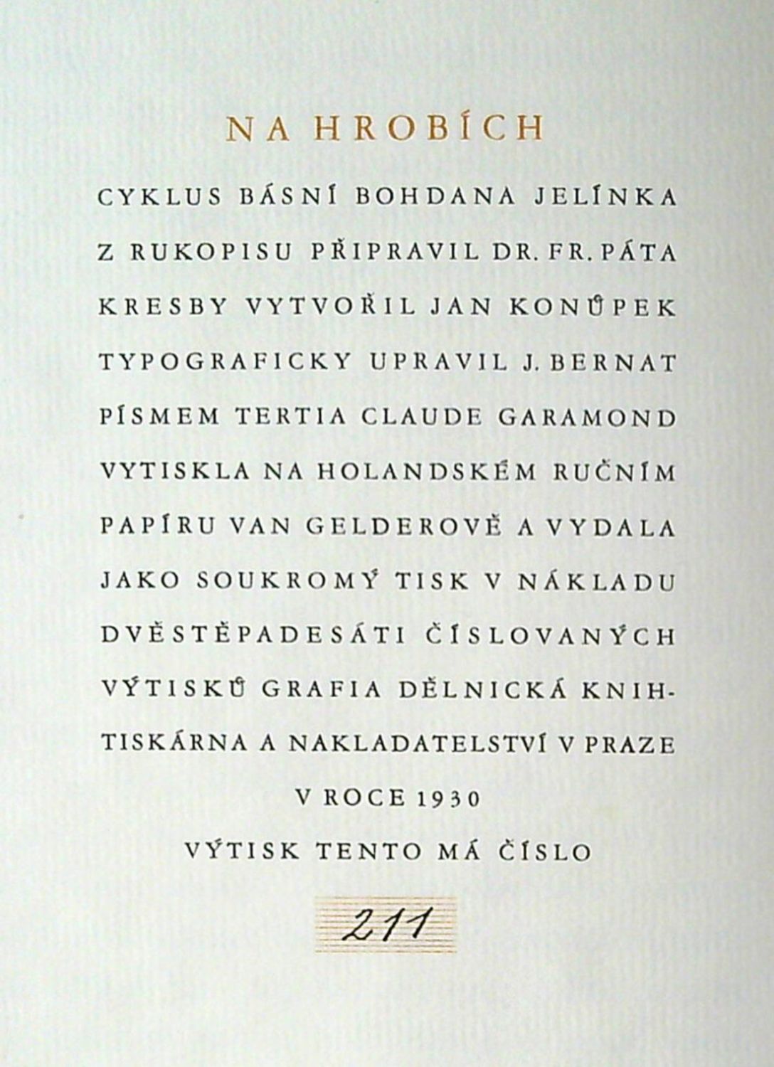 Exemplář č. 211 z 250 vydaných výtisků tištěných písmem Claude garamond na holandský ruční papír Van gelder. Cyklus básní Bohdana Jelínka z rukopisu připravil Dr. František Páta.<br>