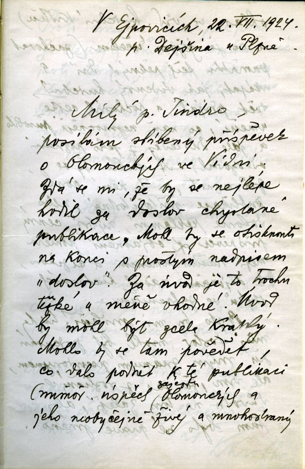 Na předsádce vlepeno exlibris autora, tit. list duplicitně, mezi oběma vevázán třístánkový dopis K. Krofty autorovi, datovaný 22.VII.1924 v Ejpovicích u Plzně, v chlopni volně přiloženo 6 listů s Kroftovým rukopisem předmluvy k této publikaci. - Desky mírně ušpiněné, přední přídeští a předsádka zahnědlá, v textu místy pozn. tužkou.