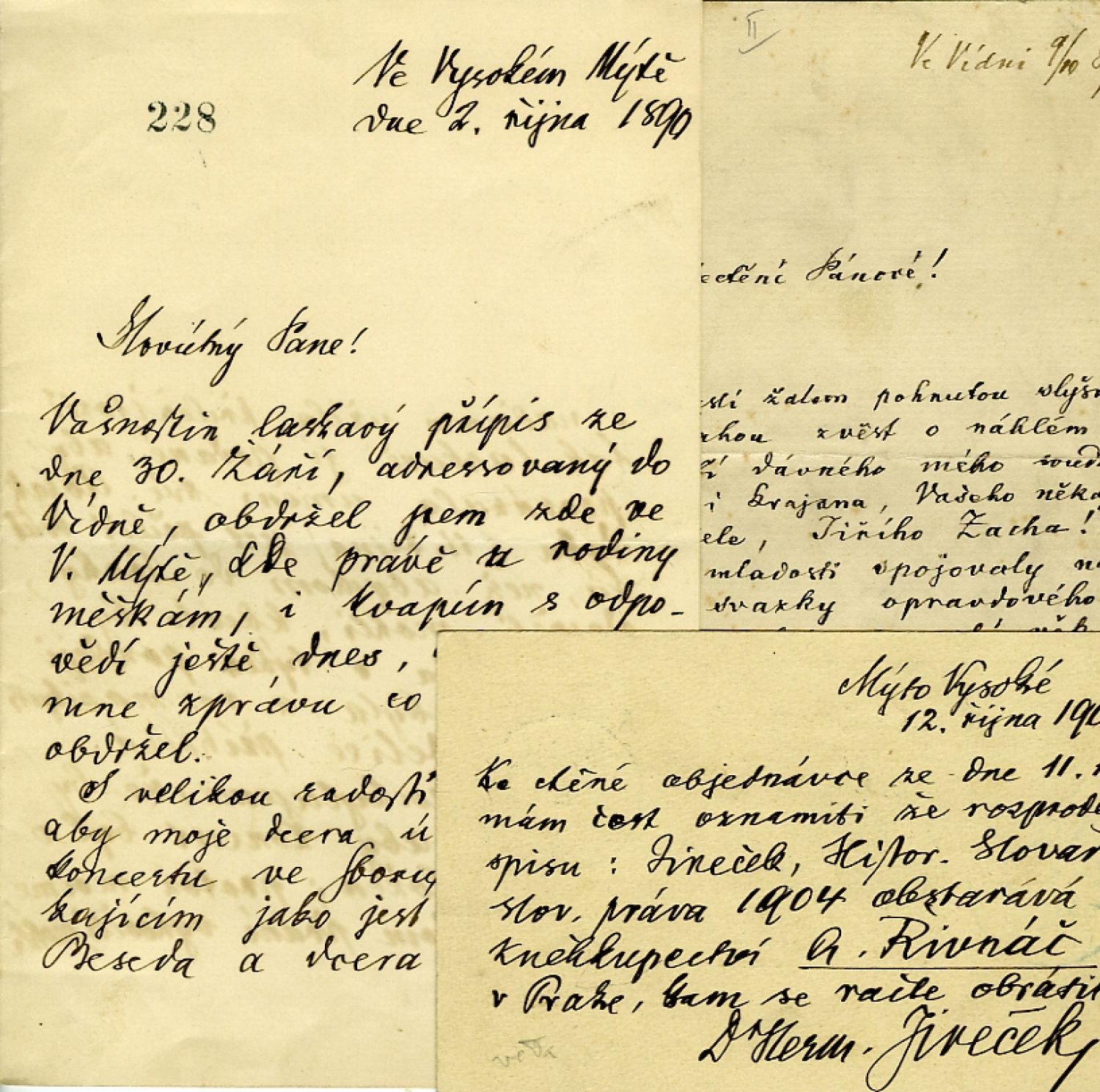 2) V půli přeložený dvoulist 215 x 137 mm popsaný po třech stranách černým inkoustem. Dopis neznámému datovaný ve Vysokém Mýtě 2.10.1890; pisatel by s velikou radostí přivolil, aby jeho dcera účastnila se koncertu ve sboru Měšťanské Besedy, avšak doba jest příliš krátká.<br>