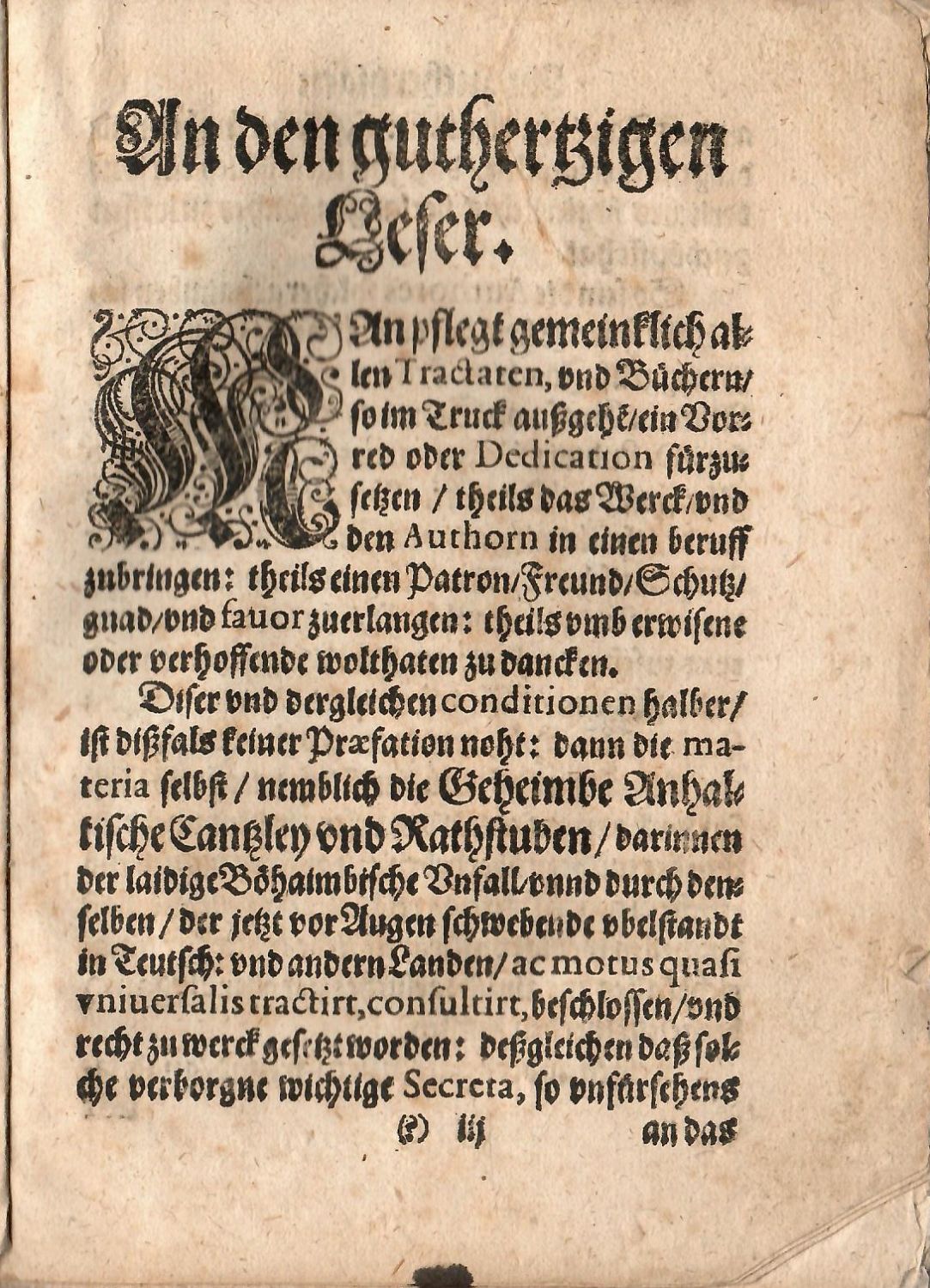 Fürstl; Anhaltische gehaimbe Cantzley/ das ist: Gegründte anzaig/ der verdeckten/ unteutschen/ nachtheiligen consilien, auschläg vnd practicken/ welche der Correspondierenden Vnion Häupter vnd Directores, in der Böhaimischen Unruhe/ zu derselben Cron/ auch deß H. Römischen Reichs höchster gefahr geführt/ und auß sonderbarer verordnung Gottes/ durch die den 8. Nouember jüngst für gangne ernstliche/ nambhaffte Böhaimische Niderlag vor Prag/ in der Anhaltischen gehaimen Cantzley in originali gefunden und der Welt kundtbar worden. Allen so wol auß: als innländischen Potentaten/ Chur: Fürsten/ Ständen und Herzschafften auch sonst menigklich zu beständiger nachricht/ trewhertziger warnung/ und warhaffter information. Edition Tertia & Correctior.