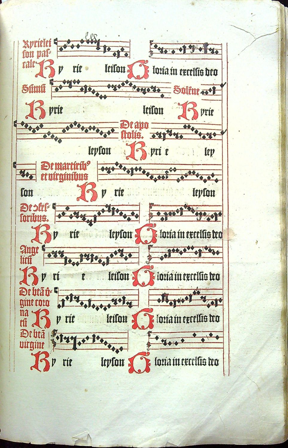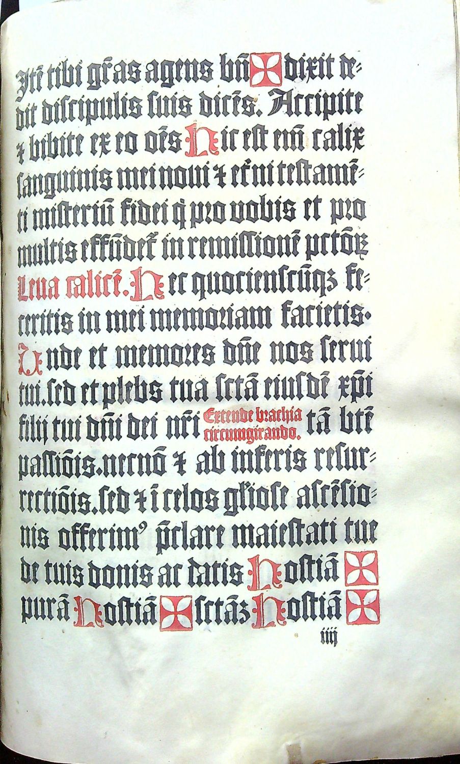 OCLC 1000024997; KVK eviduje pouze jeden nekompletní exemplář ve Státní knihovně v Berlíně, VD16 ZV 21183 (dodatky) eviduje pouze nekompl. ex. ve Státní knihovně v Berlíně; SKC eviduje 1 ex. v Moravské zemské knihovně v Brně (bez přílohy tištěné na pergamenu); Werle-Bohatta "Catalogus Missalium" č. 616 (bez kolace)<br>Foliace: X, A-N8, O10, A8, B6, C8, ▩4, VIII (na pergamenu), P-Q10, R-S8, T-V10, X-Z8, a-i8, k-10, l-7. Tištěno texturou, červeně tištěný titulní list, červeno-černý tisk ve dvou sloupcích, živá záhlaví tištěná červeně, červeně tištěné konturové iniciály zdobené ornamentem ve výši 3 řádků, červeně tištěné versálky ve výši 1-3 řádků. Na foliu A1 malovaná iniciála s rozvilinou, v horní části zdobená plátkem zlata (spodní plátek odloupnutý), v textu 9 malovaných červeno-modro-bílých obrysových iniciál ve výši 6 řádků. Mezi římsky paginovanými listy CXIIII-CXV 22 listů se čtyřřádkovou notací a 4 listy s textem týkajícím se míšeňské diecéze, na dalších osmi listech tištěných dvoubarevně v jednom sloupci na pergamenu "Canon missae" (TE igit(ur) clementissime pater ....), vstupní malovaná iniciála T ve tvaru stylizovaného kříže zdobená plátkovým zlatem a zalomená do výše 5 řádků, na líci prvého listu ručně kolorovaný a zlacený dřevořez (270 x 160 mm) s vyobrazením ukřižovaného Ježíše. V textu řada vevázaných dobových záložek z pergamenu.<br>Dobová renesanční vazba (dle kolků a válečků vznikla v Lipsku), bukové desky potažené světlou vepřovicí zdobenou slepotiskem, v rozích původní plechové nárožnice a pukly (též uprostřed desek vazby), na přední desce dva původní plechové úchyty, na desce zadní dvě kožené přezky s kovovými sponami, ve hřbetu 5 vazů, na předním přídeští nalepena rkp. notace s textem z první půle 16. století. Folia CCXLIIII-CCXLV; CCXLVIII-CCL; CCLXV (= 6 listů) při spodním okraji podlepené a dolité (bez zásahu do textu), na titulním listu místy drobné hnědé skvrnky. Kompletní exemplář, který je i přes popsané závady ve stavu velmi dobrém.