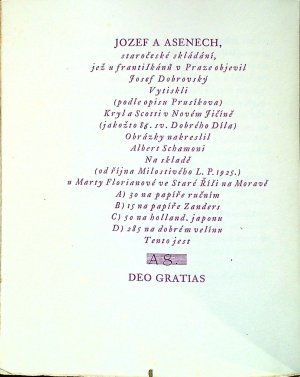 Ex. č. 8 z 30 výtisků vydání A tištěného na ručním papíře, pěti ilustracemi, ručně kolorovanými a místy zlacenými, vyzdobil Albert Schamoni. Původní pap. obálka, kterou do dřeva vyřezal Albert Vyskočil vevázána, vytiskli Kryl a Scotti v Novém Jičíně. Na posledním listu pod tištěným prvním vlastnictvím knížky perem napsáno Bartoníček, jeho podpis tužkou též na předním vakátu. Schamoniho ilustrace pravděpodobně kolorovala Marie Florianová-Stritzková.