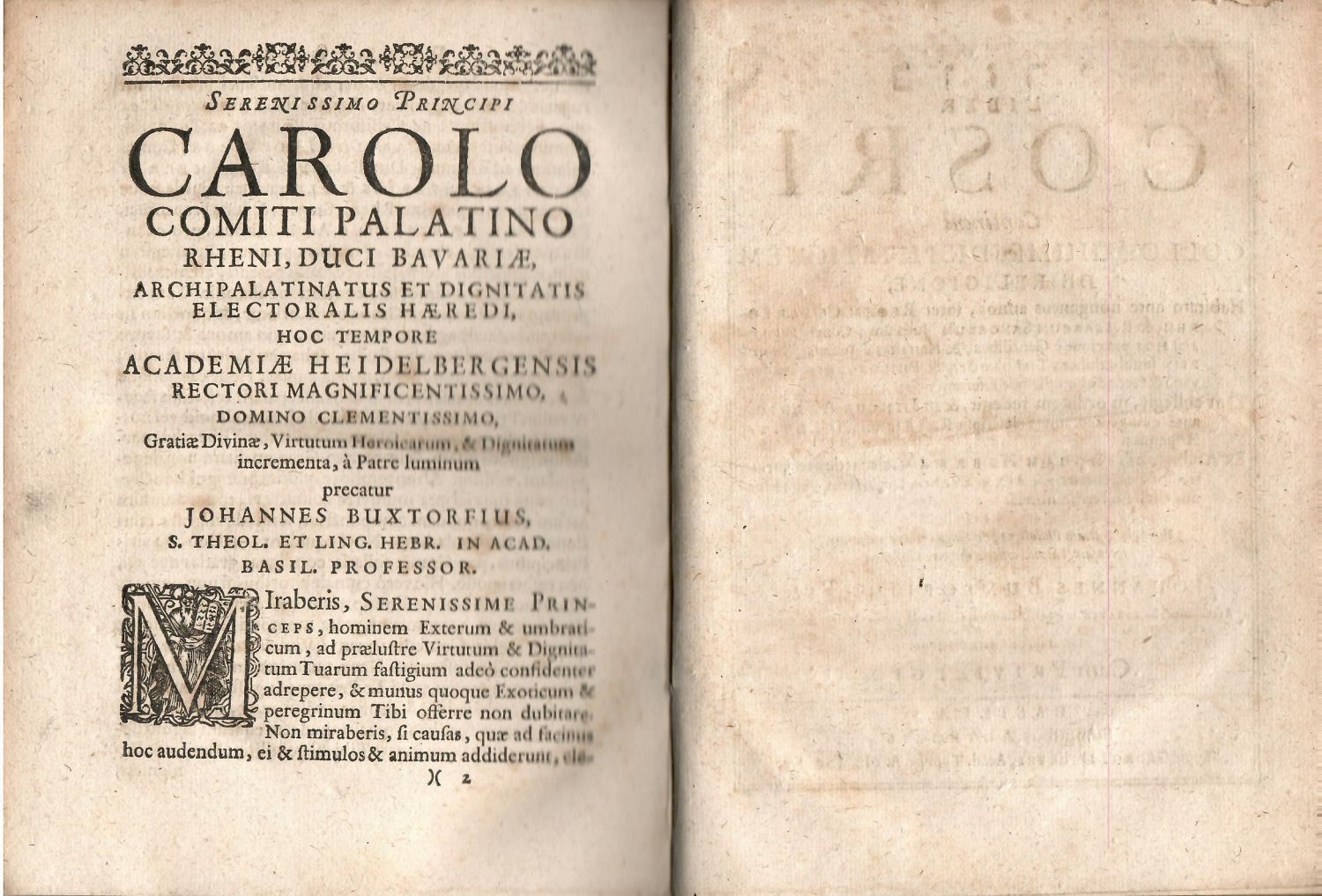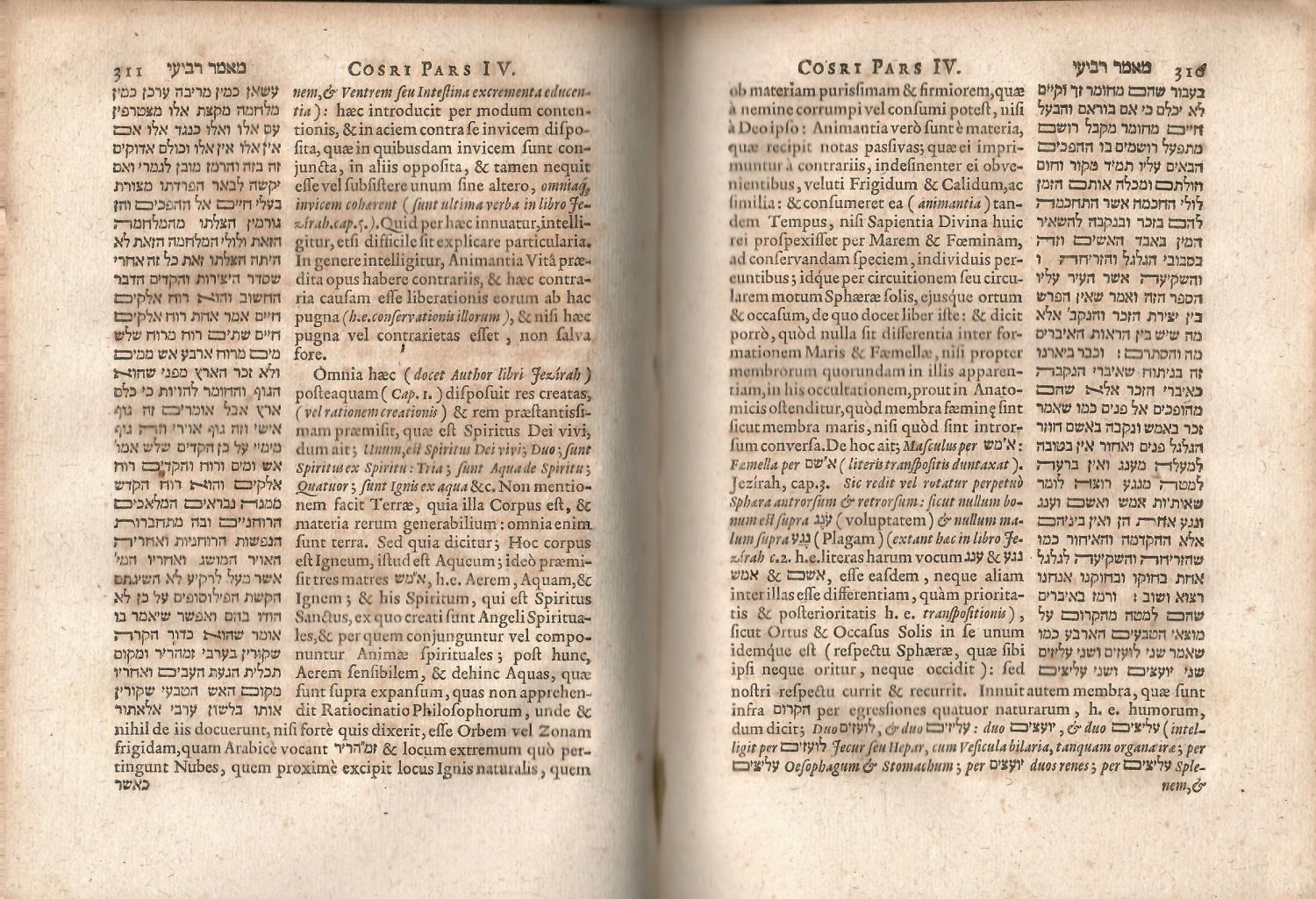 Kuzari (hebrejsky) LIBER COSRI Continens COLLOQUIUM seu DISPUTATIONEM DE RELIGIONE, Habitam ante nongentos annos, inter Regem Cosareorum, & R.I. Isaacum Sangarum Judaeum; Contra Philosophos praecipue e Gentilibus, & Karraitas e Judaeis; Synopsin simul exhibens Theologiae & Philosophiae Judaicae, varia & recondita[m] eruditione refertam; Eam collegit, in ordinem redegit, & in Lingua Arabica ante quingentos annos descripsit R. Jehudah Levita, Hispanus; Ex Arabica in Linguam Hebraeeam, circa idem tempus, transtulit R. Jehudah Aben Tybeon, itidem natione Hispanus, Civitate Jerichuntinus. Nunc, in gratiam Philologiae, et Lingua Sacra cultorum, recensuit, Latina[m] versione, et Notis illustravit.