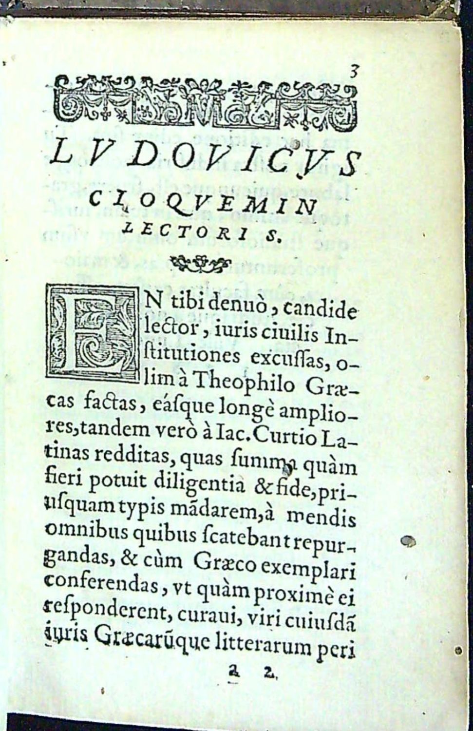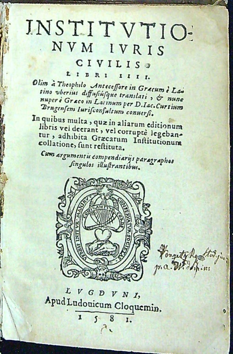 INSTITVTIONVM IVRIS CIVILIS LIBRI IIII. Olim á Theophilo Antecessore in Graecum e[t] Latino uberius diffusiu[n]sque translati, et nunc nuper e[t] Graeco in Latinum per D. Iac. Curtium Brugensem Iurisconsultum conuersi. In quibus multa, quae in aliarum editionum libris vei deerant, vel corrupte[n] legebantur, adhibita Graecarum Institutionum collatione, sunt restituta,. Cum argumentis compendiarijs paragraphes singulos illustrantibus.