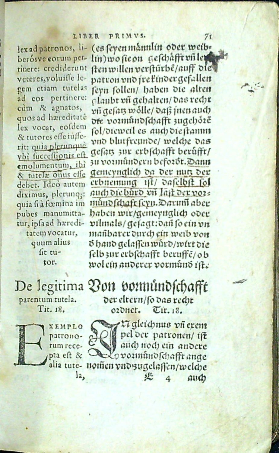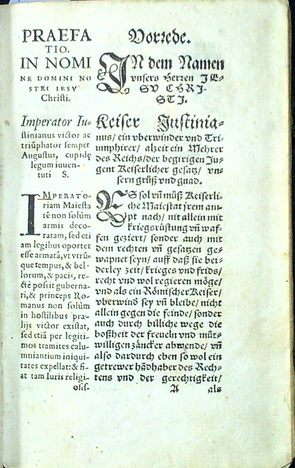 (Corpus juris) INSTITUTIONES IMPERIALES LATINOGERMANICAE. Die vier Bücher INSTITUTIONUM Keisers IUSTINIANI, der jugent im Keiserlichen Rechten zum anfang und underweisung geschrieben, durch D. IUSTINUM GOBLERUM. Jetzo erst beide texten, Latein und Teutsch, zusamen gegeneinander getruckt, und in dise form gestelt.